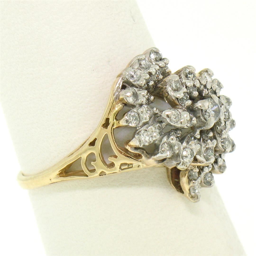 One 14k Yellow Gold 0.50ctw Round Brilliant Diamond Spiral Cluster Ring w/ Open Work Sides. Item Details: Material:  14k Solid Yellow Gold, Weight:  3.2 Grams, Stone(s):  (45) Natural Genuine Diamonds - Round Brilliant Cut - Prong Set - H Color - SI2/I1 Clarity, Total Carat Weight:  0.50 (approx.), Ring Size:  6.5 (We can custom size this ring.), Ring Width:  15.30mm, Ring Height:  8.09mm rise off the finger, Condition:  Excellent condition!