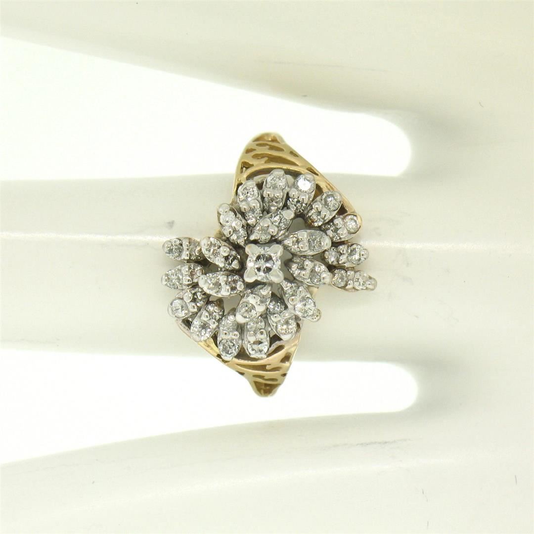 One 14k Yellow Gold 0.50ctw Round Brilliant Diamond Spiral Cluster Ring w/ Open Work Sides. Item Details: Material: 14k Solid Yellow Gold, Weight: 3.2 Grams, Stone(s): (45) Natural Genuine Diamonds - Round Brilliant Cut - Prong Set - H Color - SI2/I1 Clarity, Total Carat Weight: 0.50 (approx.), Ring Size: 6.5 (We can custom size this ring.), Ring Width: 15.30mm, Ring Height: 8.09mm rise off the finger, Condition: Excellent condition!