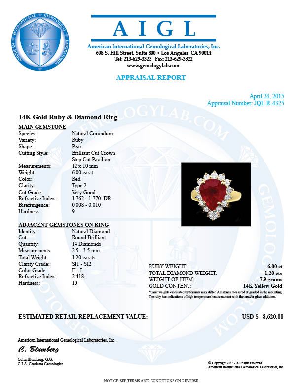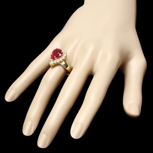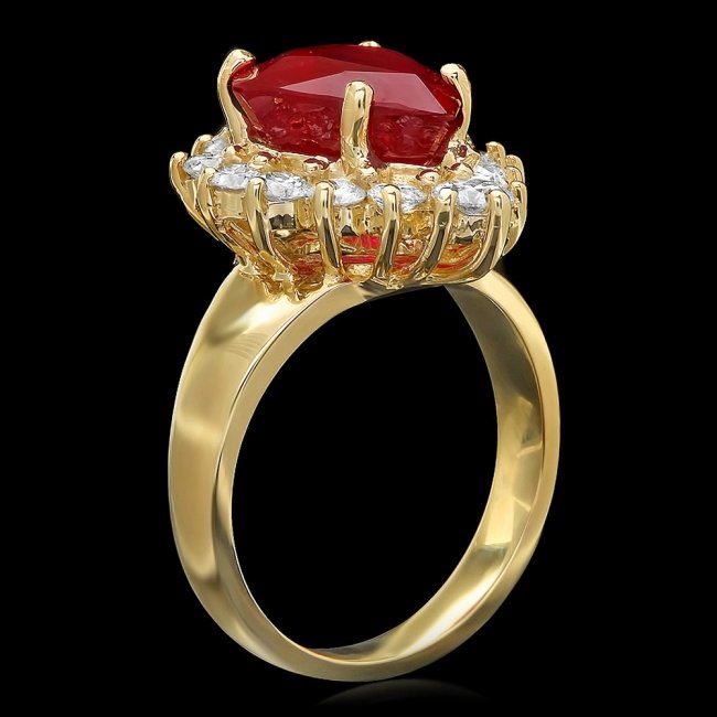 Retail: $8,500.00 ****** 14k Yellow Gold 6.00ct Ruby 1.20ct Diamond Ring ****** Metal: 14k Solid Yellow Gold / Size: 7.25 / Total Item Weight: 7.9 grams / Country Made: United States / / Main Stone: Ruby / Color: Red / Carat Total Weight: 6.00 / Treatment: Filling / Clarity: Type 2 / Cut: Very Good / / Secondary Stone: Diamond / Carat Total Weight: 1.20 / Treatment: None / Color Grade: H - I / Clarity: SI1 - SI2 / Cut: Very Good /