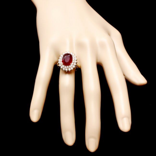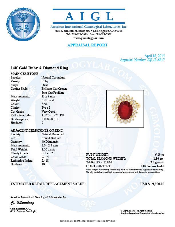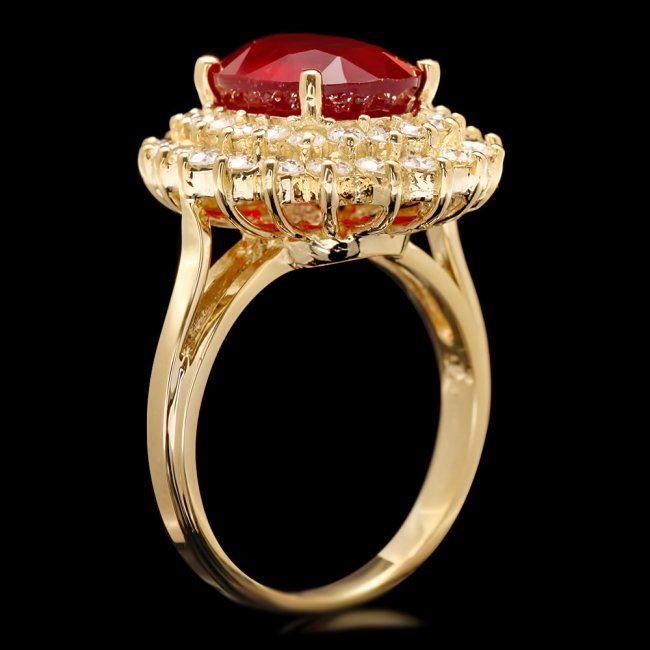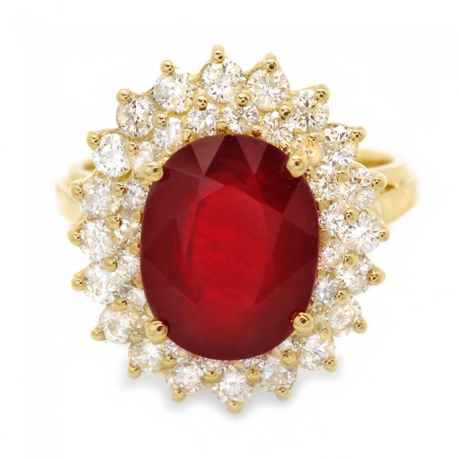 Retail: $9,850.00 ****** 14k Yellow Gold 6.20ct Ruby 1.50ct Diamond Ring ****** Metal: 14k Solid Yellow Gold / Size: 7 / Total Item Weight: 7.0 grams / Country Made: United States / / Main Stone: Ruby / Color: Red / Carat Total Weight: 6.20 / Treatment: Filling / Clarity: Type 2 / Cut: Very Good / / Secondary Stone: Diamond / Carat Total Weight: 1.50 / Treatment: None / Color Grade: G - H / Clarity: SI1 - SI2 / Cut: Very Good /