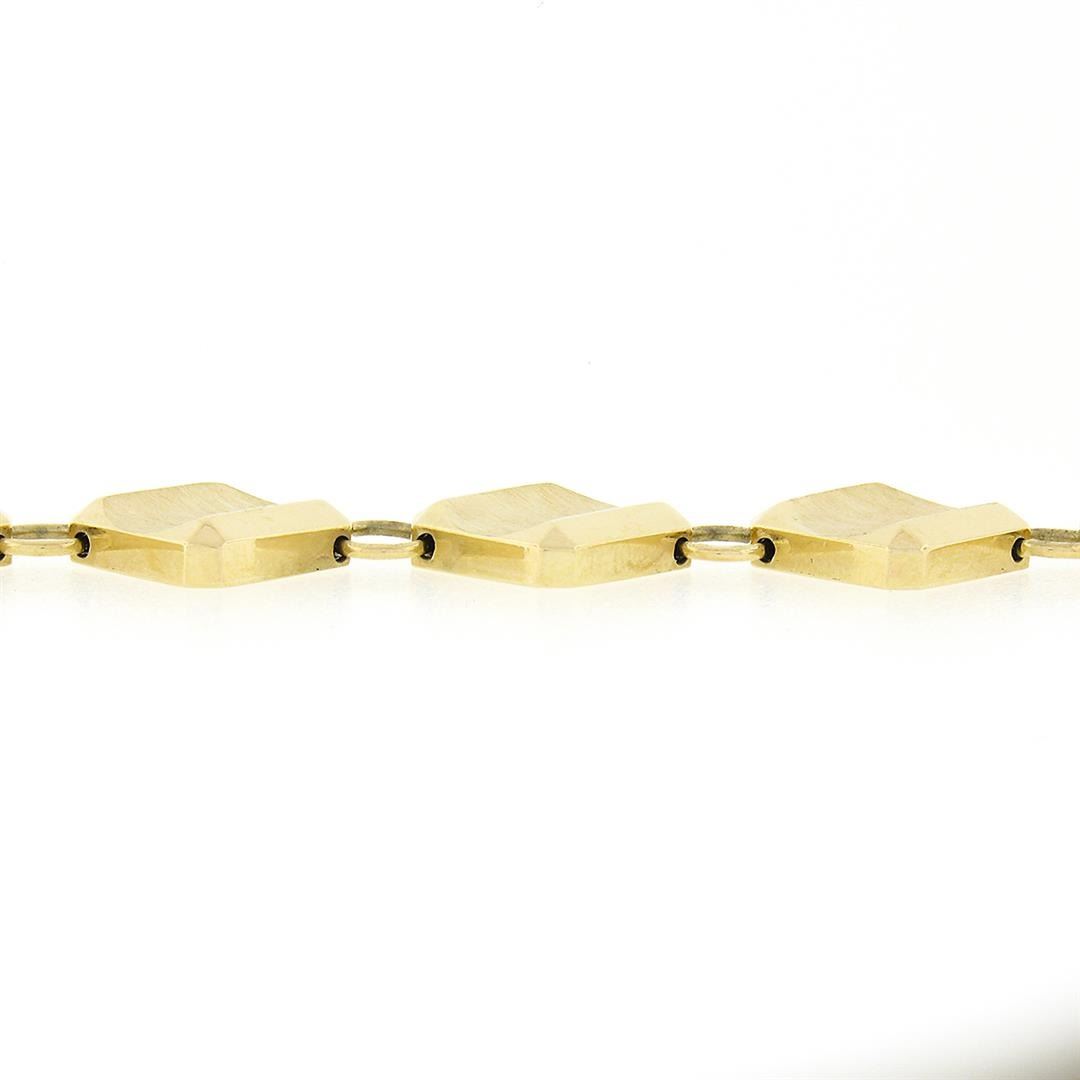 A solid 14k yellow gold bracelet. It weighs a total of 13 grams, measures 14mm wide, and measures 6.5 inches in length.