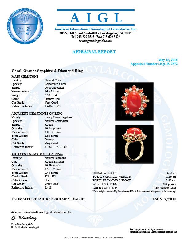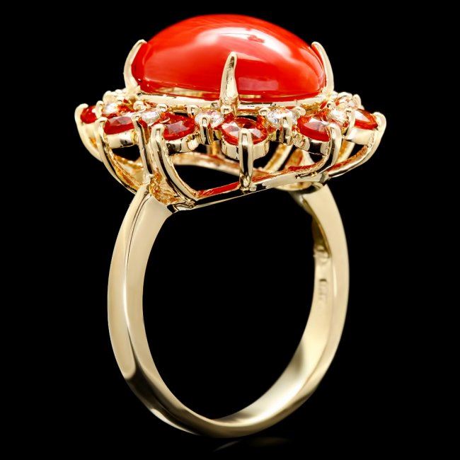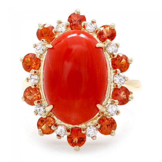 Retail: $7,900.00 ****** 14k Yellow Gold 6.50ct Coral 0.40ct Diamond Ring ****** Metal: 14k Solid Yellow Gold / Size: 7.5 / Total Item Weight: 8.0 grams / Country Made: United States / / Main Stone: Coral / Color: Orange / Carat Total Weight: 6.50 / Treatment: None / Clarity: Type 2 / Cut: Very Good / / Secondary Stone: Diamond / Carat Total Weight: 0.40 / Treatment: None / Color Grade: H - I / Clarity: SI1 - SI2 / Cut: Very Good / / Side Stone: Sapphire / Color: Orange / Carat Total Weight: 1.80 / Treatment: Heating / Clarity: Type 2 / Cut: Very Good /
