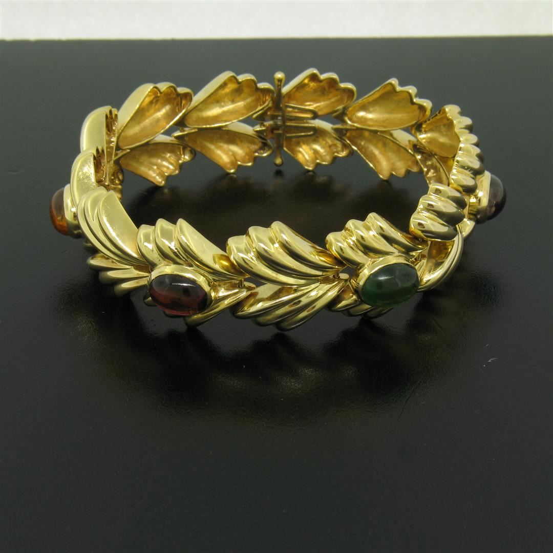 An excellent condition 14k yellow gold leaf bracelet bezel set with an oval cabochon cut green tourmaline (1.97ct), pink tourmaline (1.73ct), amethyst (1.51ct), and citrine (1.60ct). It weighs a total of 44.6 grams, measures 18.5mm wide, and measures 7 inches in length.