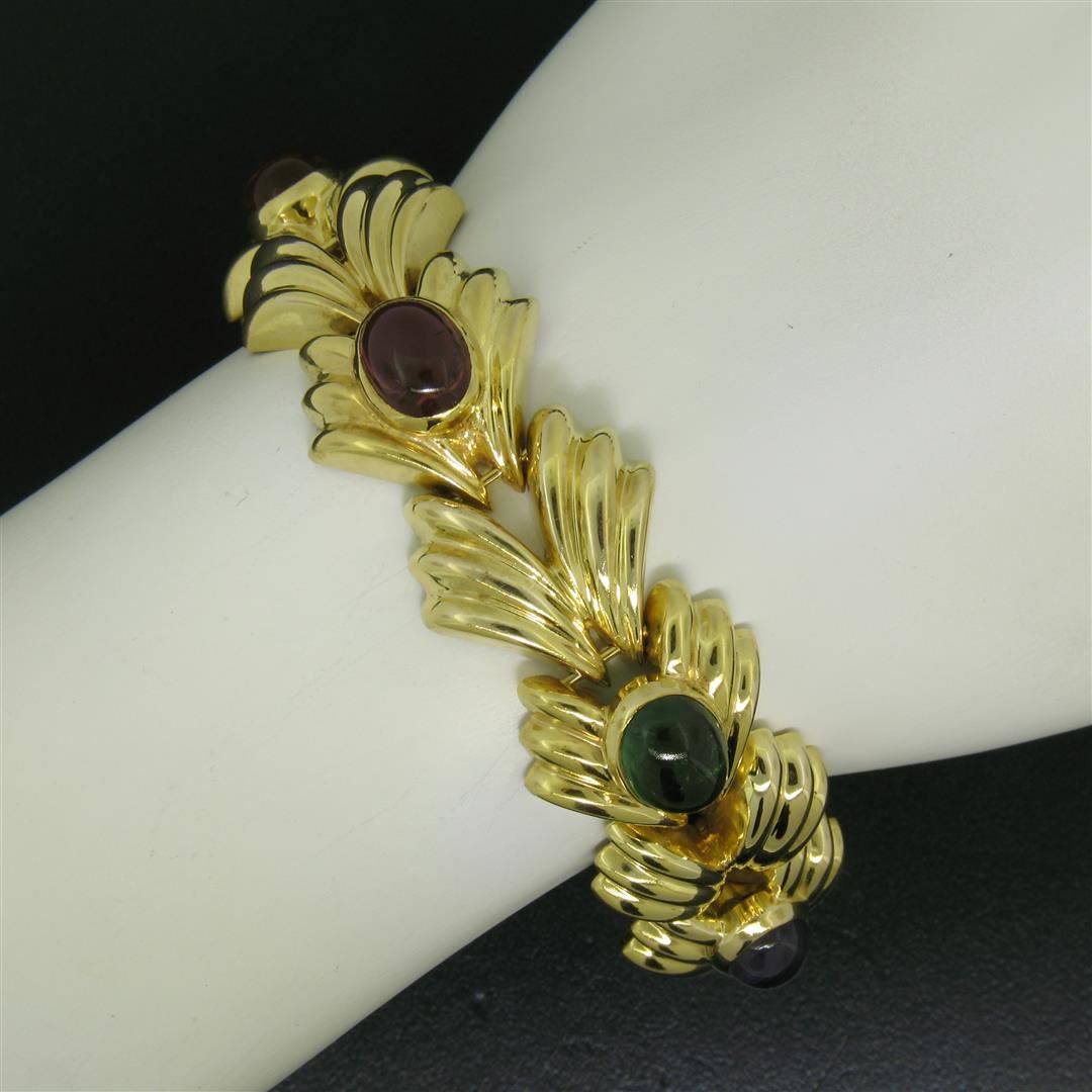 An excellent condition 14k yellow gold leaf bracelet bezel set with an oval cabochon cut green tourmaline (1.97ct), pink tourmaline (1.73ct), amethyst (1.51ct), and citrine (1.60ct). It weighs a total of 44.6 grams, measures 18.5mm wide, and measures 7 inches in length.
