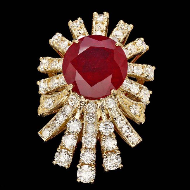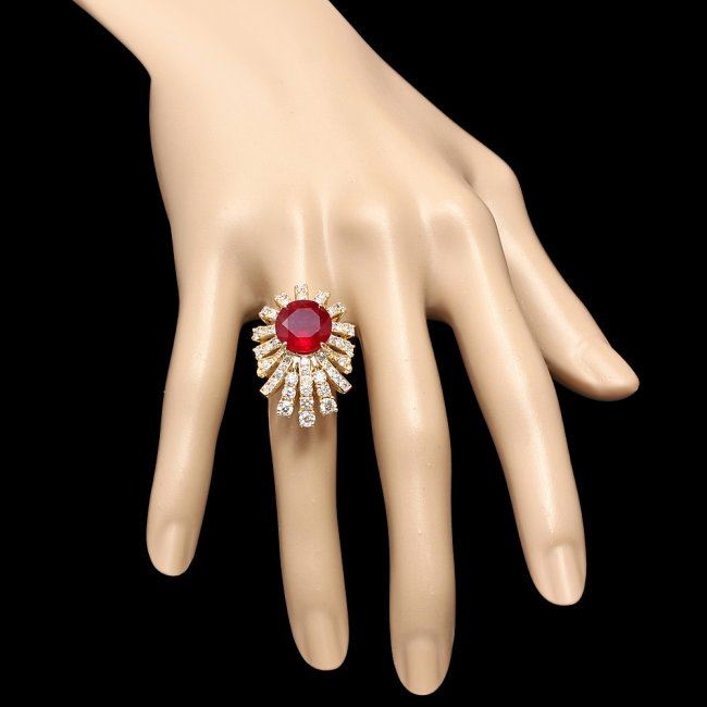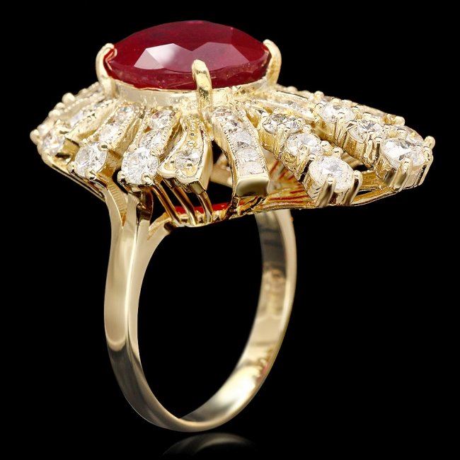 Retail: $19,850.00 ****** 14k Yellow Gold 7.00ct Ruby 2.60ct Diamond Ring ****** Metal: 14k Solid Yellow Gold / Size: 7 / Total Item Weight: 10.0 grams / Country Made: United States / / Main Stone: Ruby / Color: Red / Carat Total Weight: 7.00 / Treatment: Filling / Clarity: Type 2 / Cut: Very Good / / Secondary Stone: Diamond / Carat Total Weight: 2.60 / Treatment: None / Color Grade: G - H / Clarity: SI1 - SI2 / Cut: Very Good /