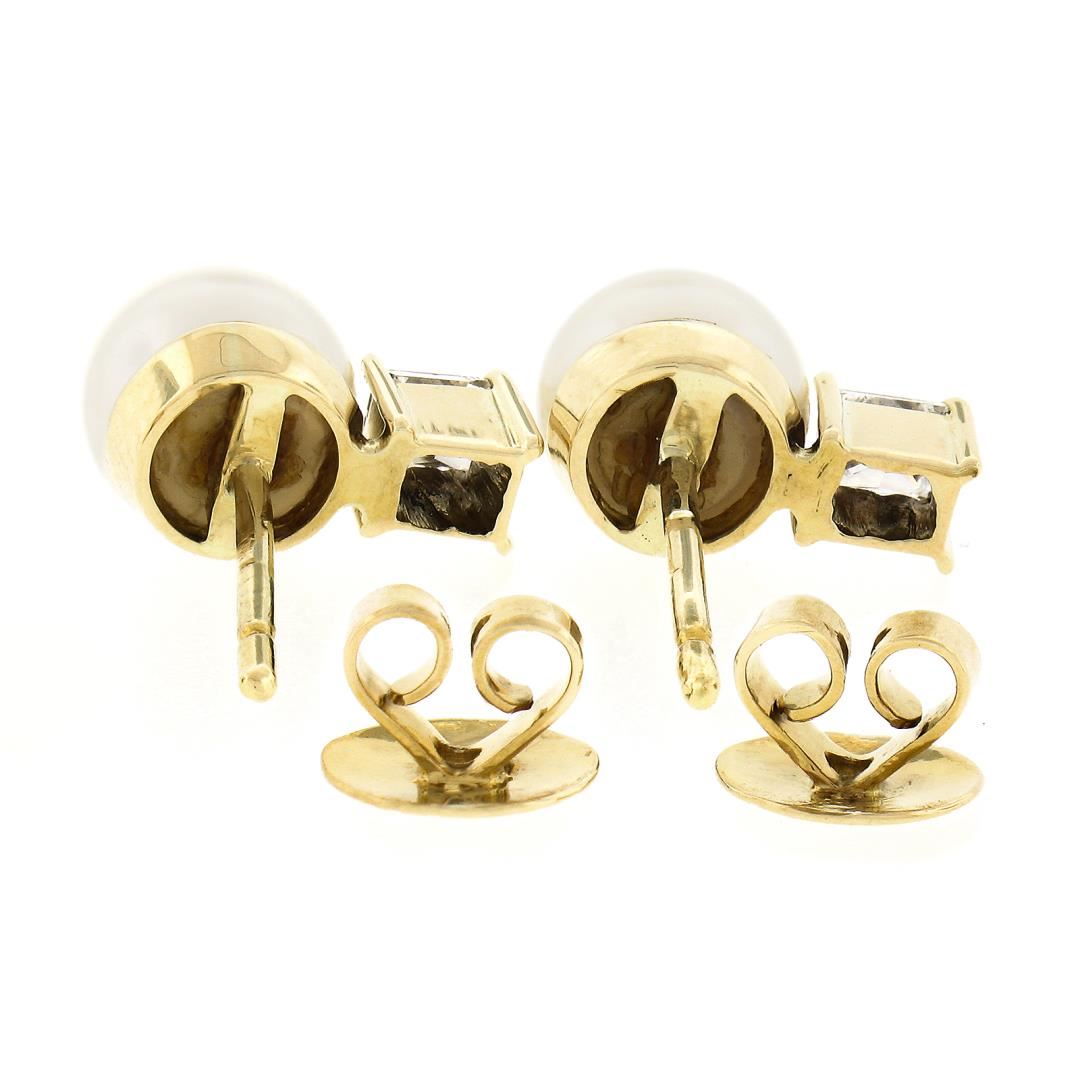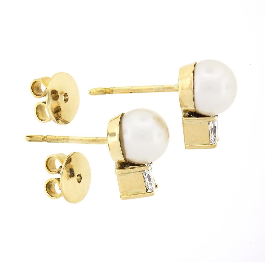 A solid 14k yellow gold drop stud earrings, featuring 1 round shape cultured pearls (7.9mm ), and 2 princess cut natural diamonds (F/G - VS1 ; 0.54ct). The earrings measure approximately 12.50x7.9mm and weigh a total of 4.16 grams.