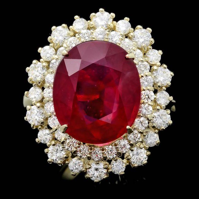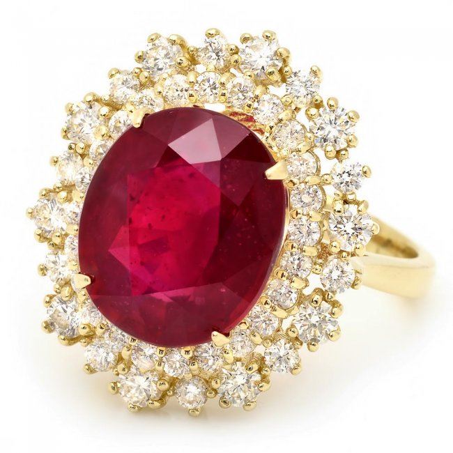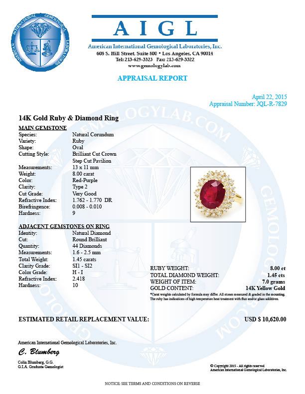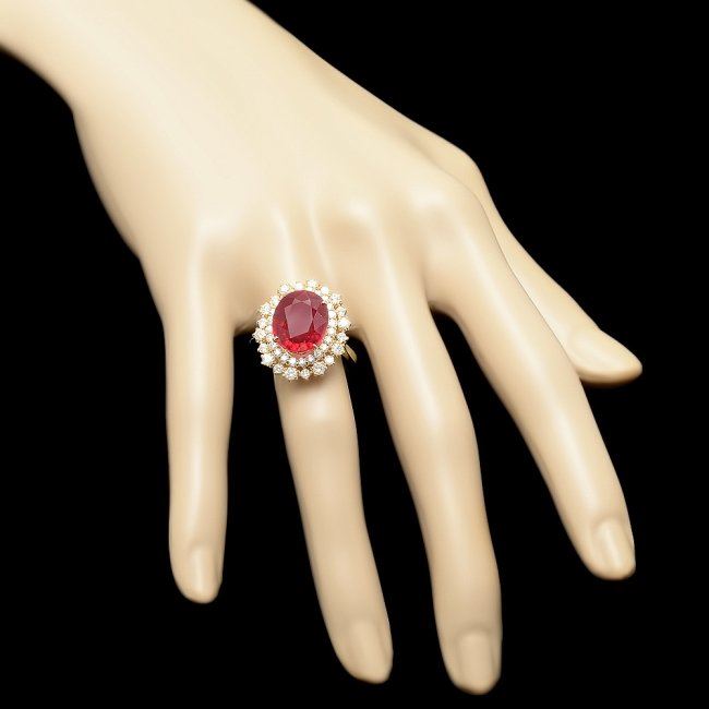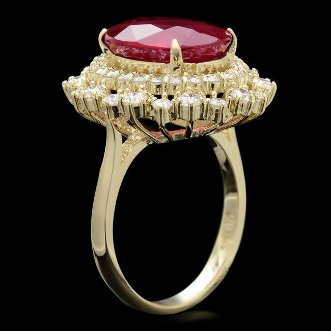 Retail: $10,500.00 ****** 14k Yellow Gold 8.00ct Ruby 1.45ct Diamond Ring ****** Metal: 14k Solid Yellow Gold / Size: 7 / Total Item Weight: 7.0 grams / Country Made: United States / / Main Stone: Ruby / Color: Red / Carat Total Weight: 8.00 / Treatment: Filling / Clarity: Type 2 / Cut: Very Good / / Secondary Stone: Diamond / Carat Total Weight: 1.45 / Treatment: None / Color Grade: H - I / Clarity: SI1 - SI2 / Cut: Very Good /