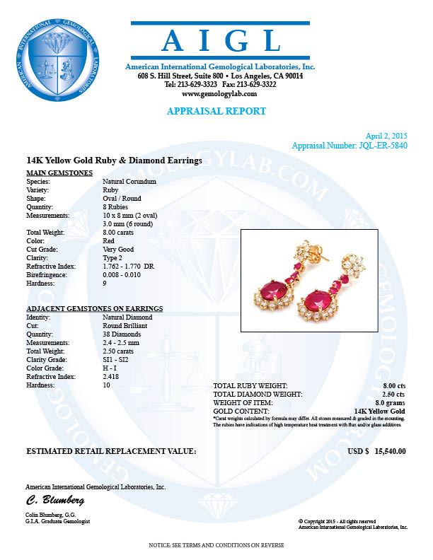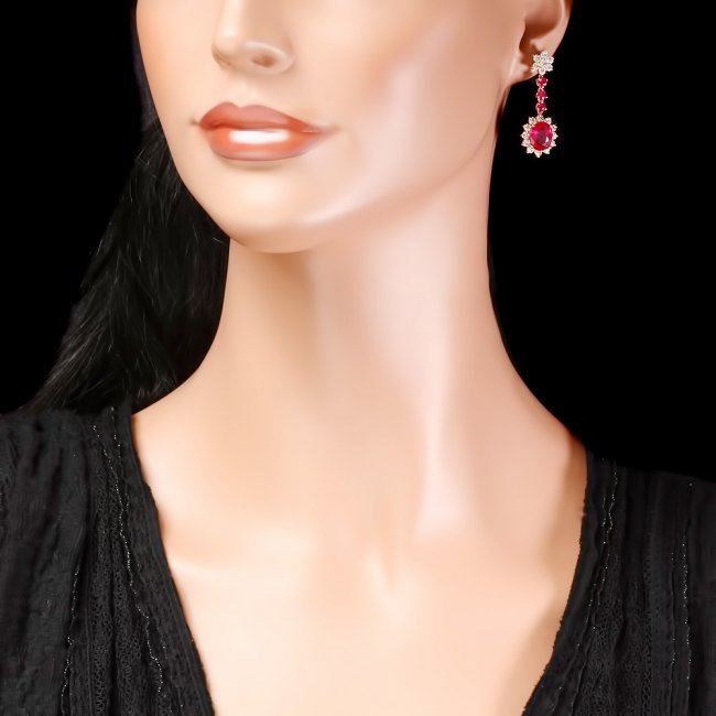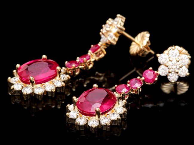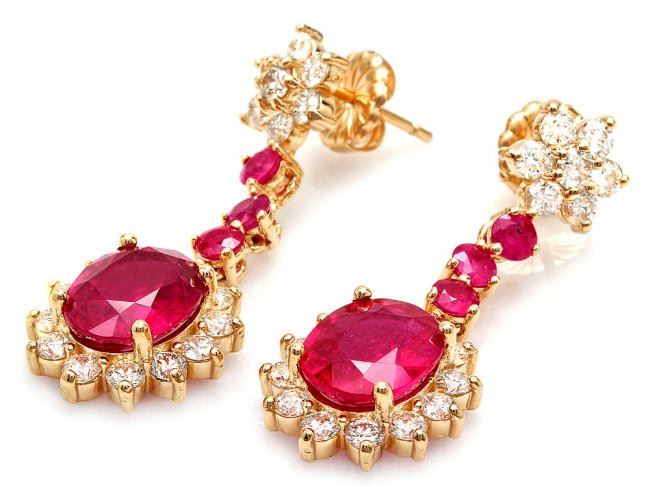 Retail: $15,470.00 ****** 14k Yellow Gold 8ct Ruby 2.50ct Diamond Earrings ****** Metal: 14k Solid Yellow Gold / Total Item Weight: 7.5 grams / Country Made: United States / / Main Stone: Ruby / Color: Red / Carat Total Weight: 7.00 / Treatment: Filling / Clarity: Type 2 / Cut: Very Good / / Secondary Stone: Diamond / Carat Total Weight: 2.50 / Treatment: None / Color Grade: H - I / Clarity: SI1 - SI2 / Cut: Very Good / / Side Stone: Ruby / Color: Red / Carat Total Weight: 1.00 / Treatment: None / Clarity: Type 2 / Cut: Very Good /