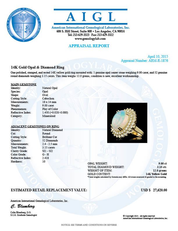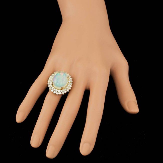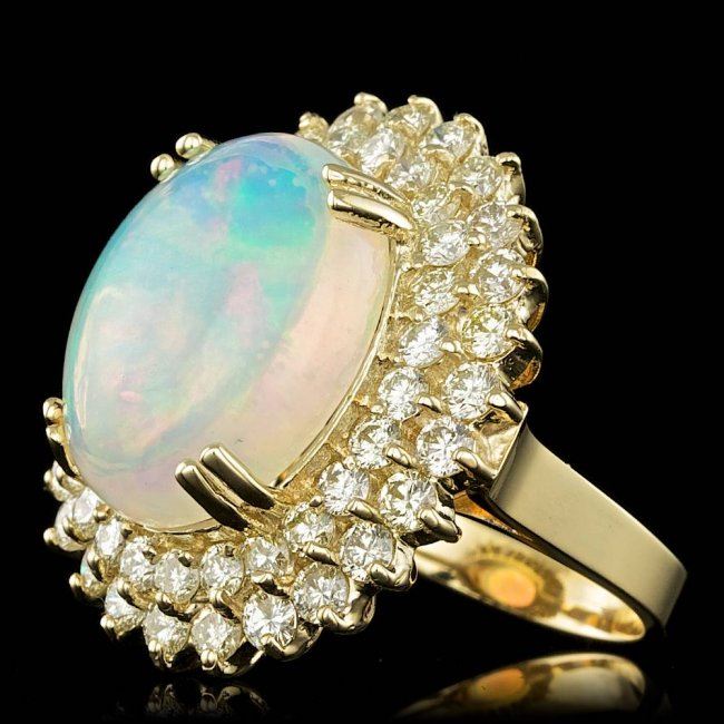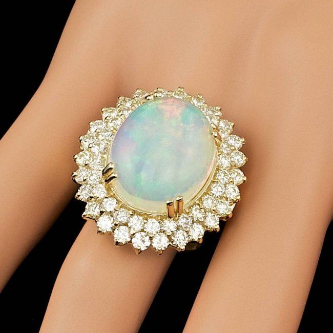 Retail: $27,500.00 ****** 14k Yellow Gold 9.00ct Opal 3.15ct Diamond Ring ****** Metal: 14k Solid Yellow Gold / Size: 7 / Total Item Weight: 12.0 grams / Country Made: United States / / Main Stone: Opal / Color: White / Carat Total Weight: 9.00 / Treatment: None / Type: White / Toughness: Good / / Secondary Stone: Diamond / Carat Total Weight: 3.15 / Treatment: None / Color Grade: G - H / Clarity: SI1 - SI2 / Cut: Very Good /