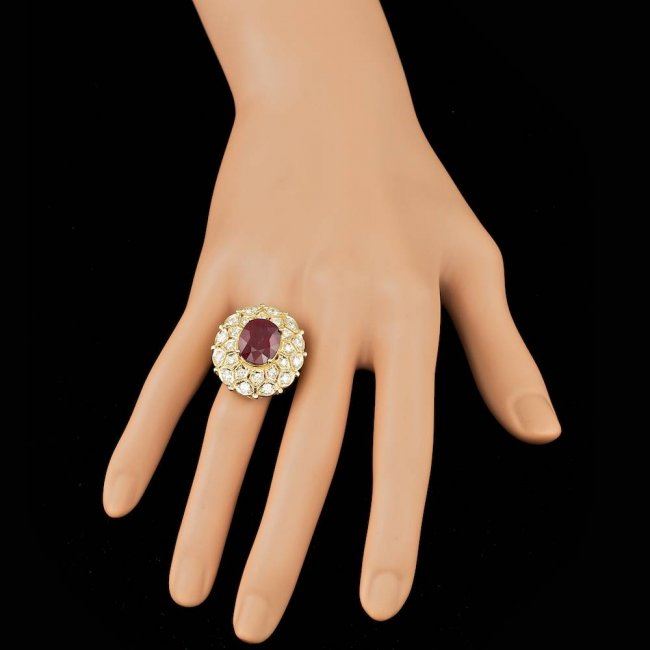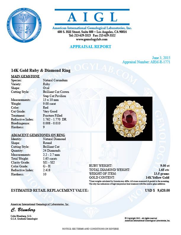 Retail: $8,400.00 ****** 14k Yellow Gold 9.00ct Ruby 1.65ct Diamond Ring ****** Metal: 14k Solid Yellow Gold / Size: 7.25 / Total Item Weight: 13.5 grams / Country Made: United States / / Main Stone: Ruby / Color: Red / Carat Total Weight: 9.00 / Treatment: Filling / Clarity: Type 2 / Cut: Very Good / / Secondary Stone: Diamond / Carat Total Weight: 1.65 / Treatment: None / Color Grade: G - H / Clarity: SI1 - SI2 / Cut: Very Good /