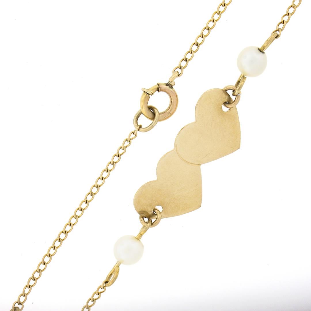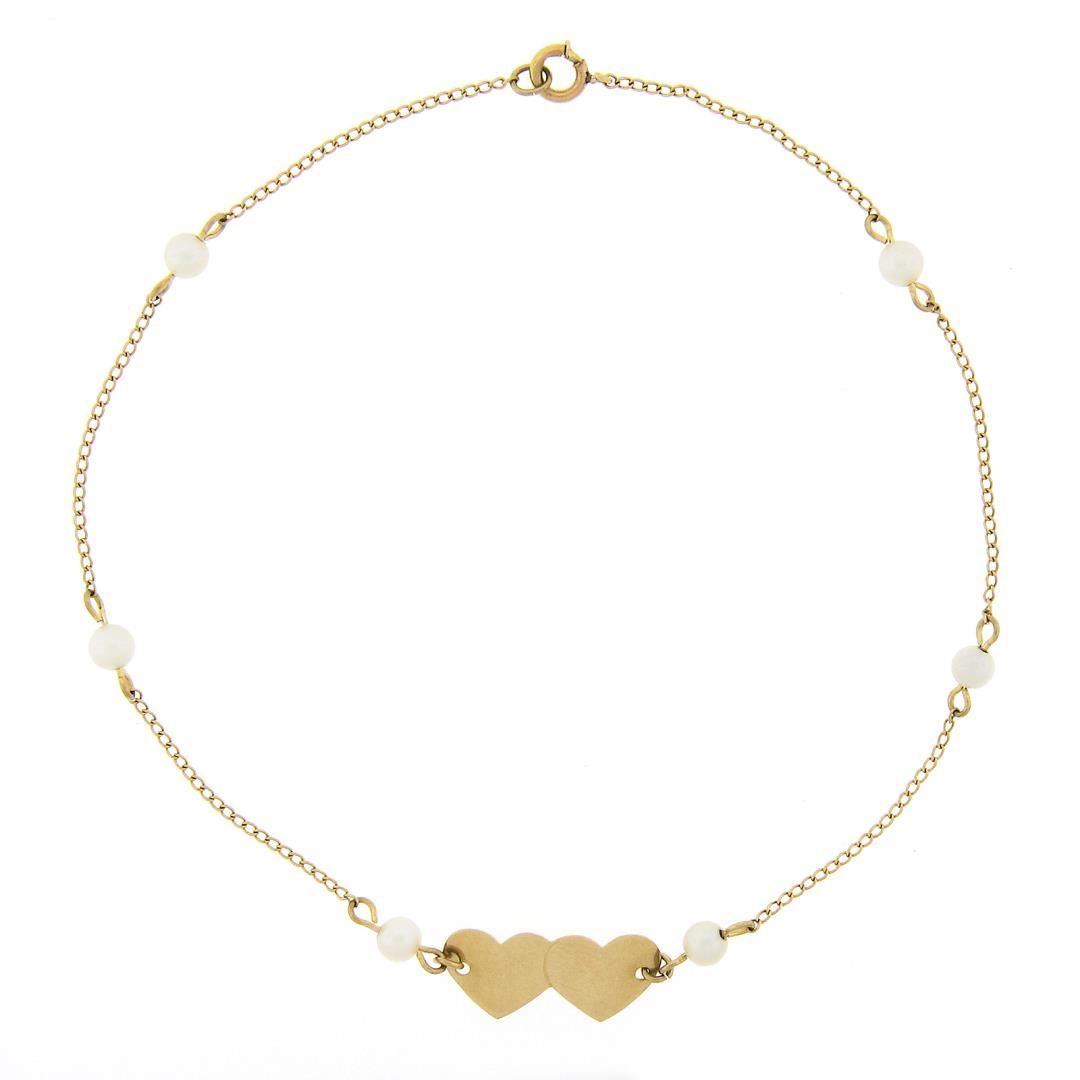 14k Yellow Gold 9" Dual Heart w/ Pearl Station Cable Link Ankle Bracelet Anklet
