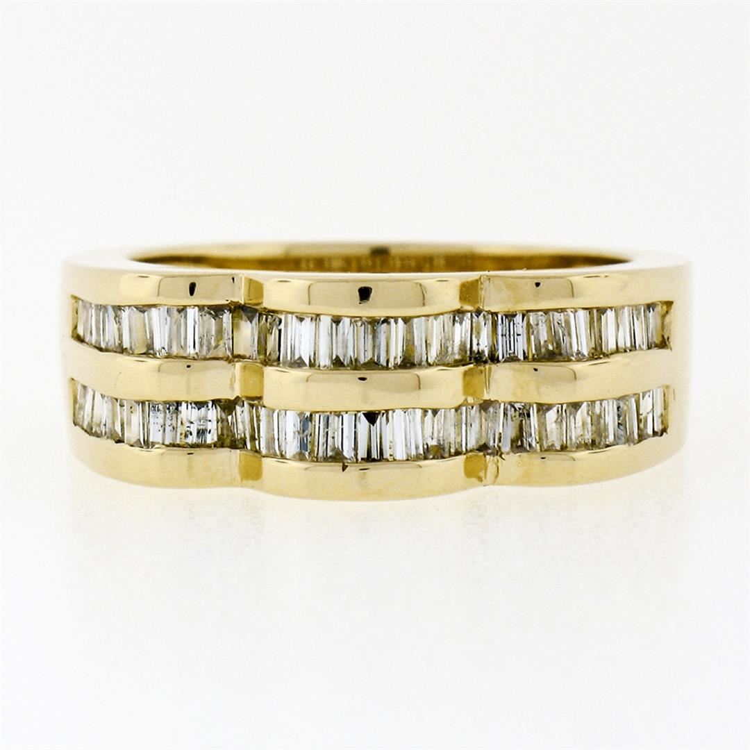One Wide 14k Yellow Gold .95ctw Baguette Cut Diamond Wavy Grooved Dual Row Band Ring. Item Details: Material: Solid 14k Yellow Gold, Weight: 7.13 Grams, Stone(s): (48) Natural Genuine Diamonds - Tapered & Straight Baguette Cut - Channel Set - I/J Color - SI2/I1 Clarity, Total Carat Weight: 0.95 (exact), Ring Size: 6.5 (We can custom size this ring.), Ring Width: 7.20mm (top of the ring), 5.20mm (bottom of the shank), Ring Height: 5.30mm rise off the finger, Condition: Like New!