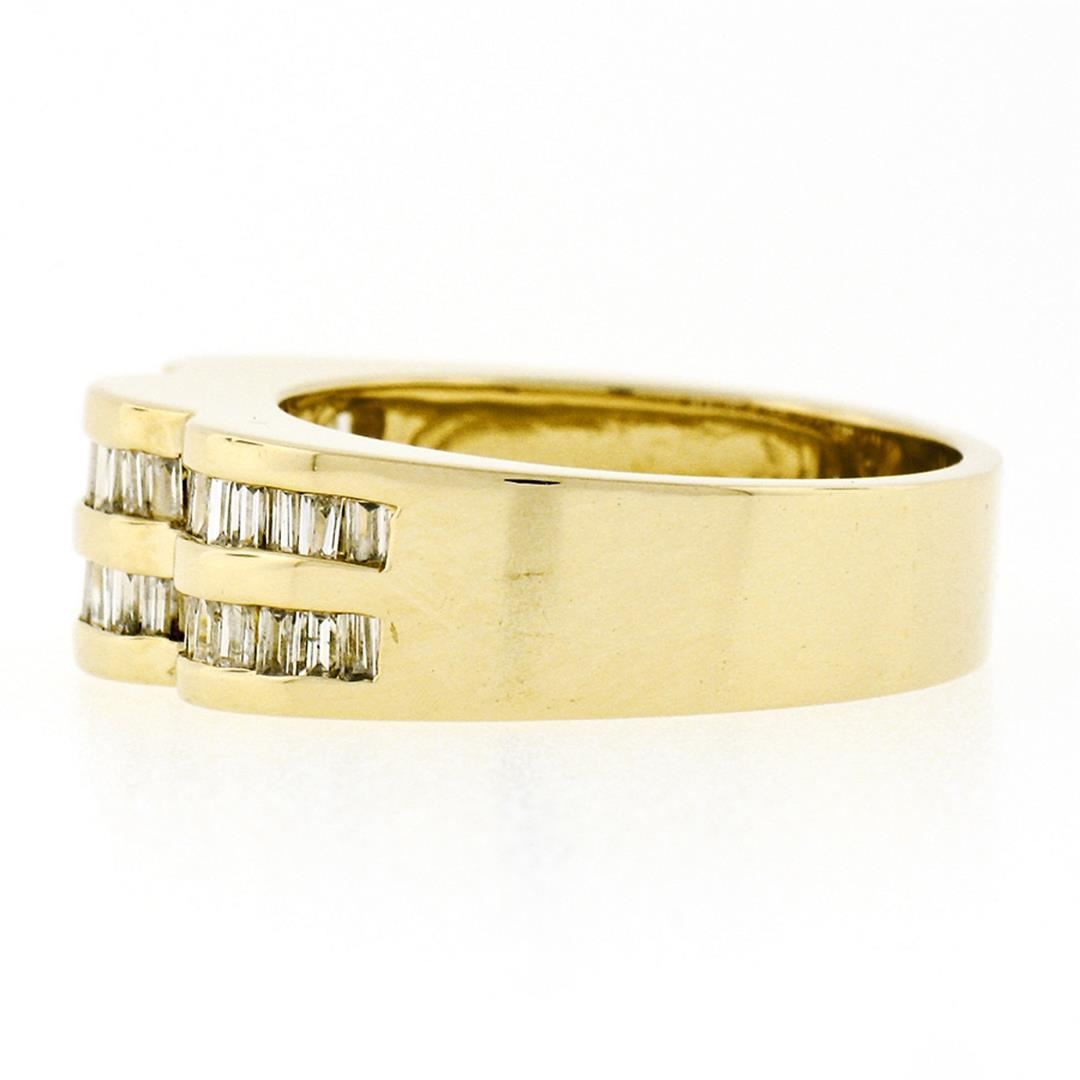 One Wide 14k Yellow Gold .95ctw Baguette Cut Diamond Wavy Grooved Dual Row Band Ring. Item Details: Material: Solid 14k Yellow Gold, Weight: 7.13 Grams, Stone(s): (48) Natural Genuine Diamonds - Tapered & Straight Baguette Cut - Channel Set - I/J Color - SI2/I1 Clarity, Total Carat Weight: 0.95 (exact), Ring Size: 6.5 (We can custom size this ring.), Ring Width: 7.20mm (top of the ring), 5.20mm (bottom of the shank), Ring Height: 5.30mm rise off the finger, Condition: Like New!