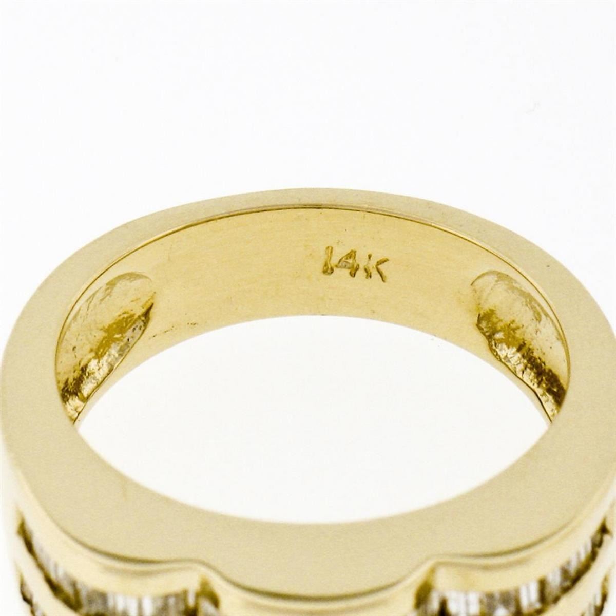 One Wide 14k Yellow Gold .95ctw Baguette Cut Diamond Wavy Grooved Dual Row Band Ring. Item Details: Material: Solid 14k Yellow Gold, Weight: 7.13 Grams, Stone(s): (48) Natural Genuine Diamonds - Tapered & Straight Baguette Cut - Channel Set - I/J Color - SI2/I1 Clarity, Total Carat Weight: 0.95 (exact), Ring Size: 6.5 (We can custom size this ring.), Ring Width: 7.20mm (top of the ring), 5.20mm (bottom of the shank), Ring Height: 5.30mm rise off the finger, Condition: Like New!