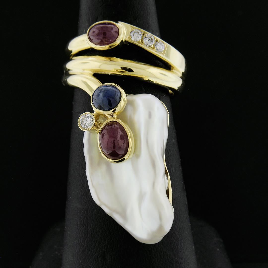 14k Yellow Gold Baroque Pearl w/ Diamond, Cabochon Ruby & Sapphire Wrap Ring