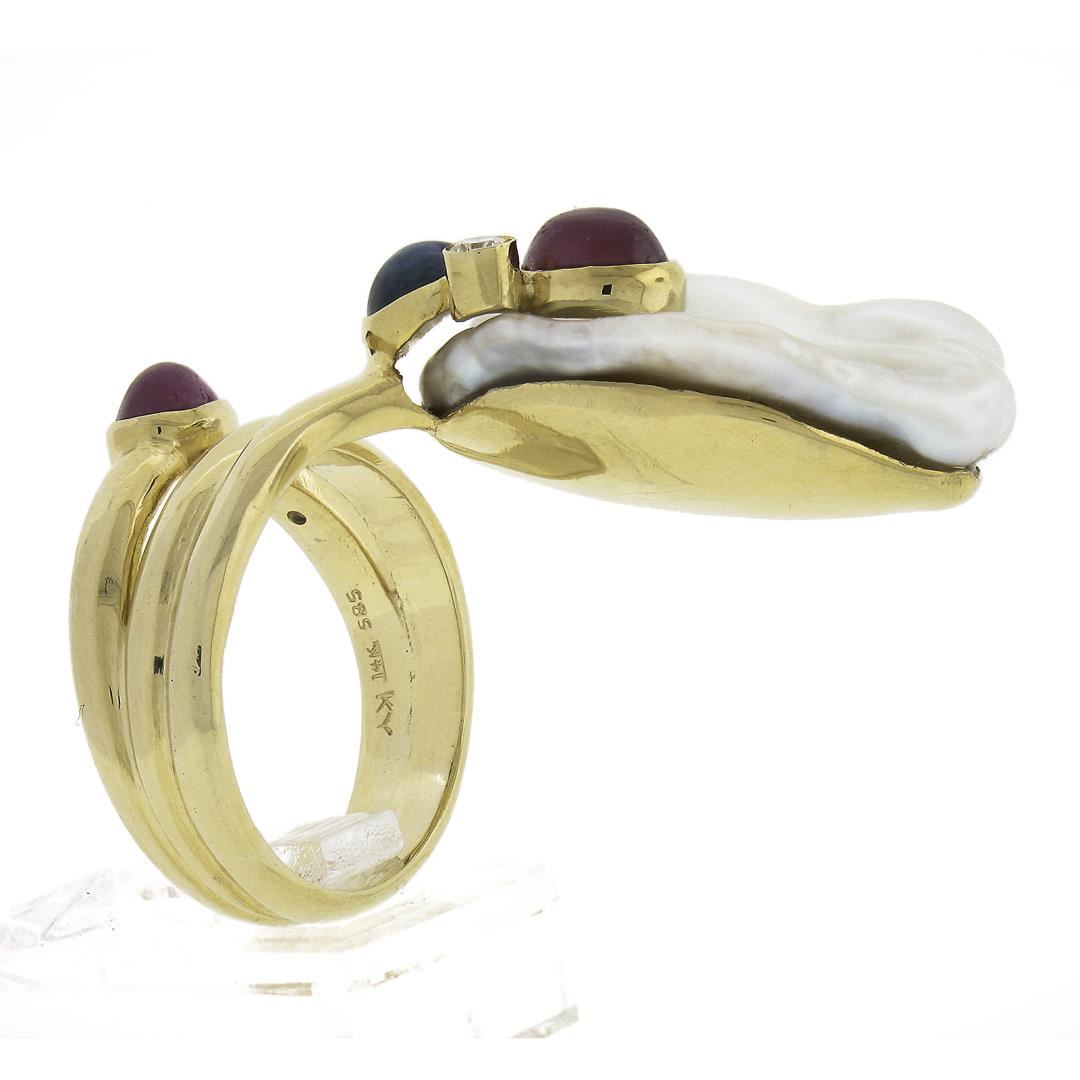 14k Yellow Gold Baroque Pearl w/ Diamond, Cabochon Ruby & Sapphire Wrap Ring