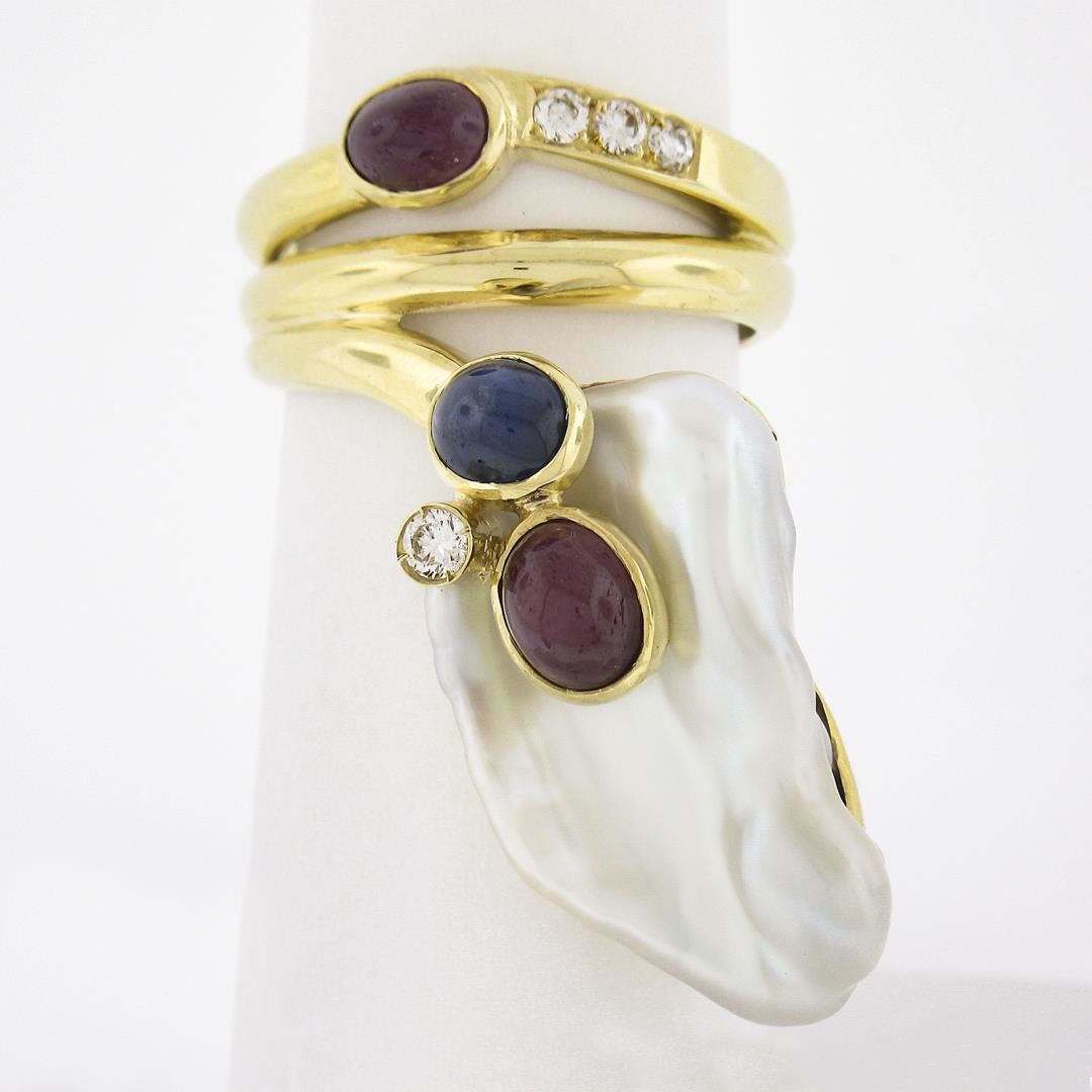 14k Yellow Gold Baroque Pearl w/ Diamond, Cabochon Ruby & Sapphire Wrap Ring