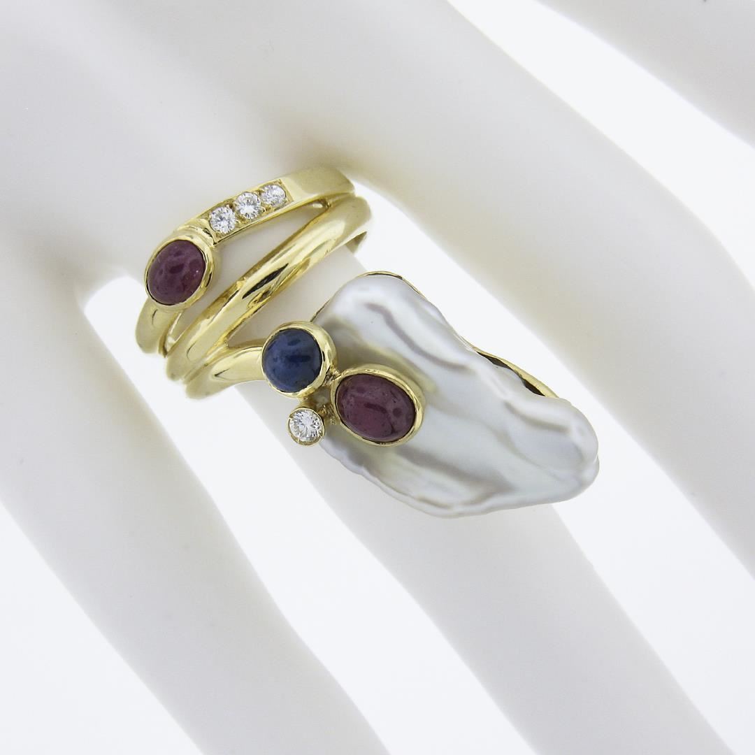 14k Yellow Gold Baroque Pearl w/ Diamond, Cabochon Ruby & Sapphire Wrap Ring