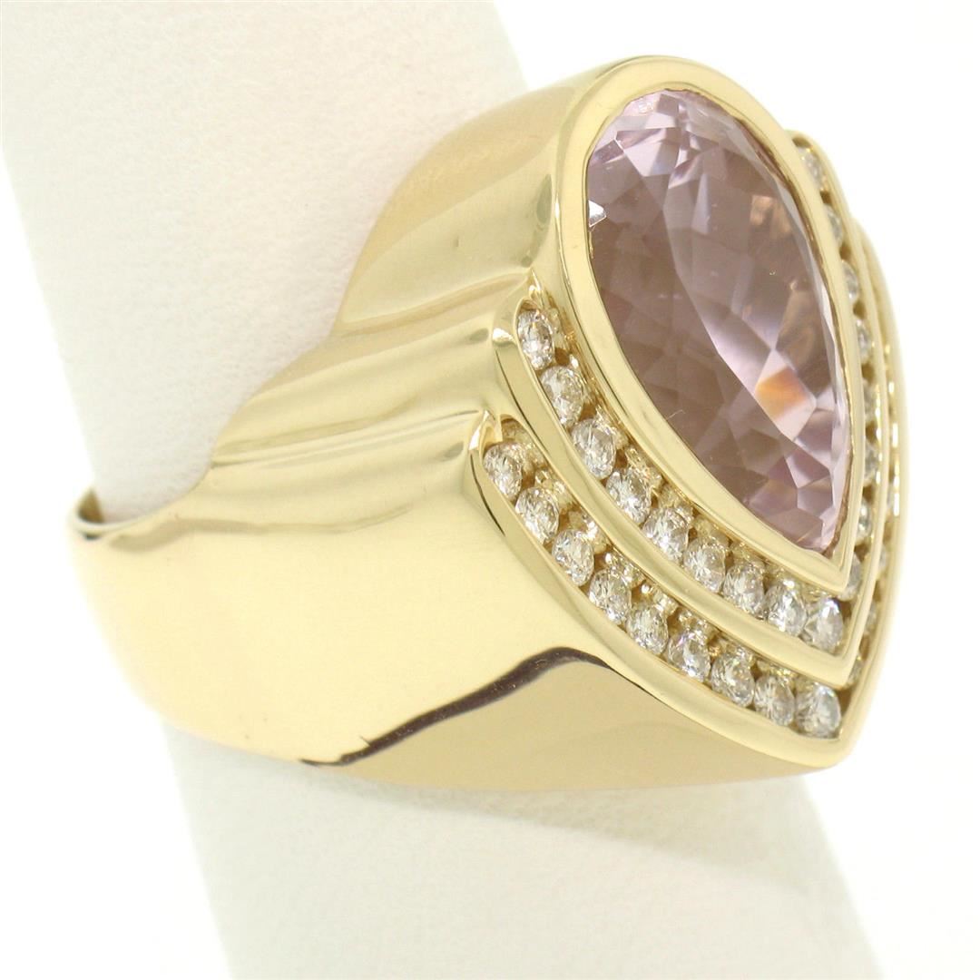 One 14k Yellow Gold Bezel Pear Morganite & Diamond Channels 8.05ctw Large Ring. Item Details - Material: 14k Solid Yellow Gold, Weight: 11.0 Grams, Stone(s): (1) Natural Genuine Morganite - Pear Cut - Bezel Set - Rich Pastel Pink Color - 9.35x14.30mm / 7.05ct (approx.), (34) Natural Genuine Diamonds - Round Brilliant Cut - Channel Set - F Color - VS1 Clarity - 1.00ctw (approx.), Total Carat Weight: 7.55 (approx.), Ring Size: 6.0, Ring Width: 21.66mm, Ring Height: 10.58mm rise off the finger, Condition: Like New!