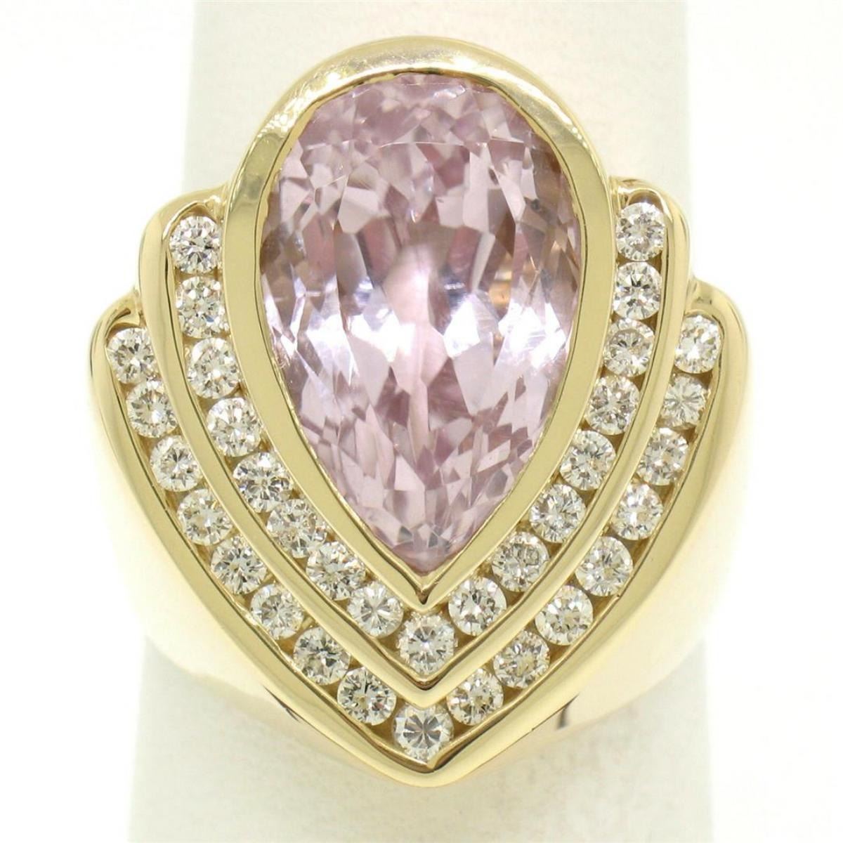 One 14k Yellow Gold Bezel Pear Morganite & Diamond Channels 8.05ctw Large Ring. Item Details - Material: 14k Solid Yellow Gold, Weight: 11.0 Grams, Stone(s): (1) Natural Genuine Morganite - Pear Cut - Bezel Set - Rich Pastel Pink Color - 9.35x14.30mm / 7.05ct (approx.), (34) Natural Genuine Diamonds - Round Brilliant Cut - Channel Set - F Color - VS1 Clarity - 1.00ctw (approx.), Total Carat Weight: 7.55 (approx.), Ring Size: 6.0, Ring Width: 21.66mm, Ring Height: 10.58mm rise off the finger, Condition: Like New!