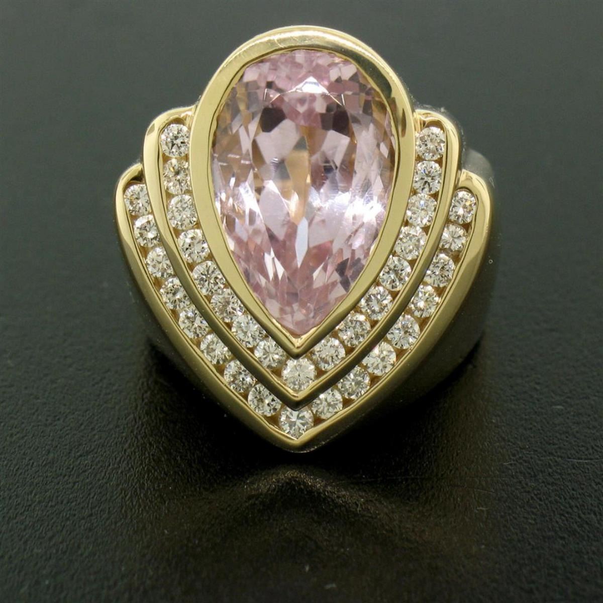 One 14k Yellow Gold Bezel Pear Morganite & Diamond Channels 8.05ctw Large Ring. Item Details - Material: 14k Solid Yellow Gold, Weight: 11.0 Grams, Stone(s): (1) Natural Genuine Morganite - Pear Cut - Bezel Set - Rich Pastel Pink Color - 9.35x14.30mm / 7.05ct (approx.), (34) Natural Genuine Diamonds - Round Brilliant Cut - Channel Set - F Color - VS1 Clarity - 1.00 ctw (approx.), Total Carat Weight: 7.55 (approx.), Ring Size: 6.0, Ring Width: 21.66mm, Ring Height: 10.58mm rise off the finger, Condition: Like New!