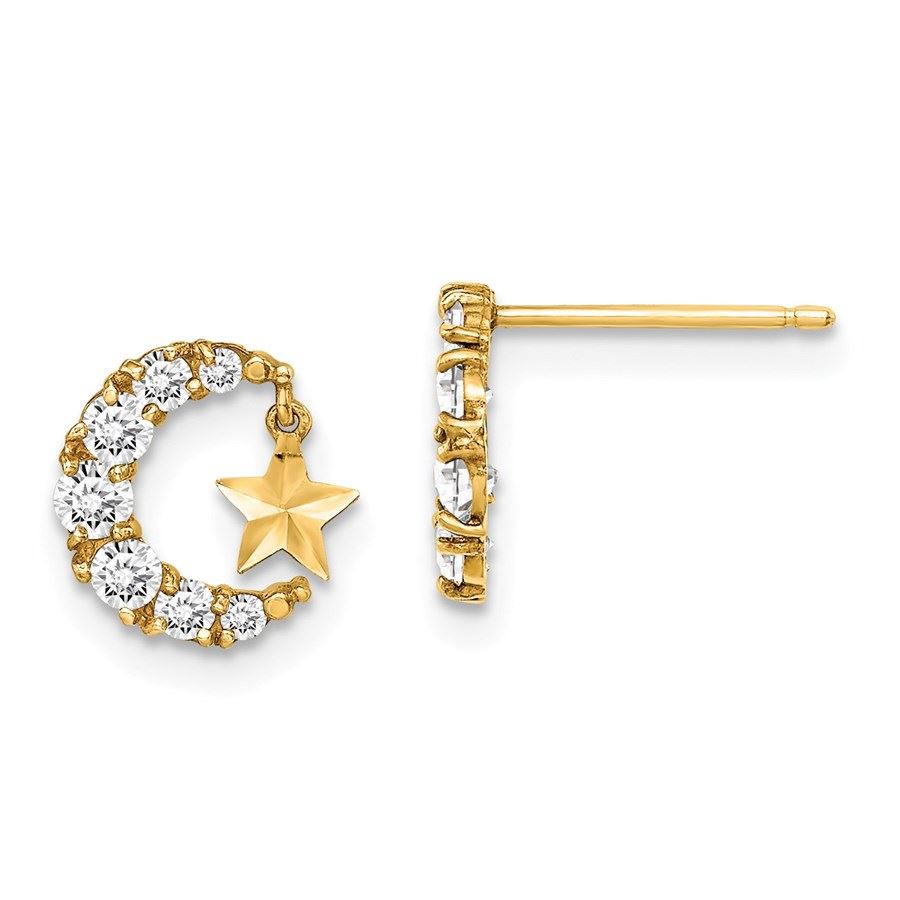 14k Yellow Gold CZ Moon w/ Star Dangle Post Earrings - 63 mm