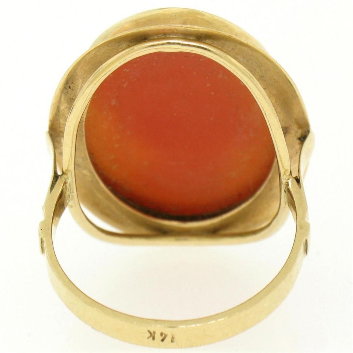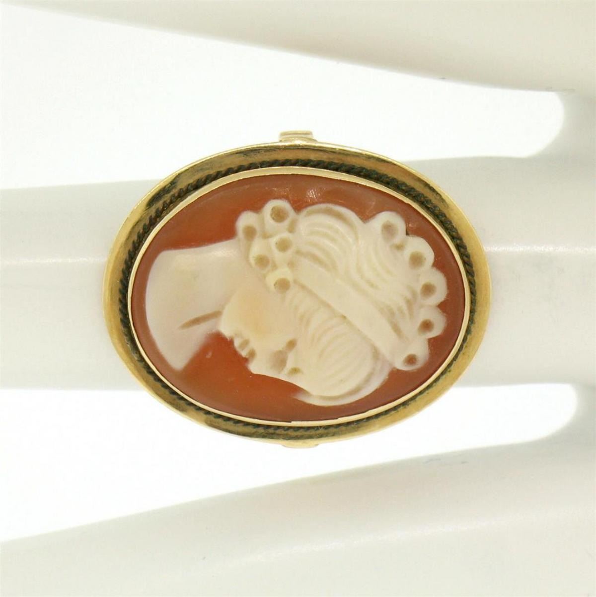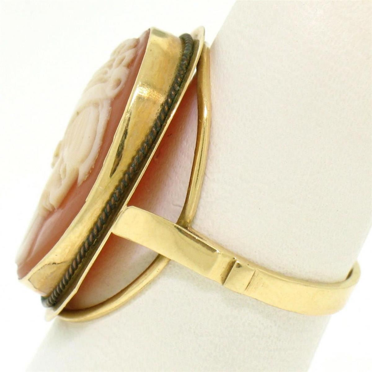 One Vintage 14k Yellow Gold Carved Shell Cameo Ring w/ Twisted Wire Frame Size 5.5. Item Details: Material: 14k Solid Yellow Gold, Weight: 3.3 Grams, Stone(s): (1) Genuine Carved Shell Cameo - Oval Shape - Bezel Set - 14.78x19.48mm, Ring Size: 5.5 (We can custom size this ring.), Ring Width: 22.89mm, Ring Height: 6.10mm rise off the finger, Condition: Vintage piece. Excellent condition!
