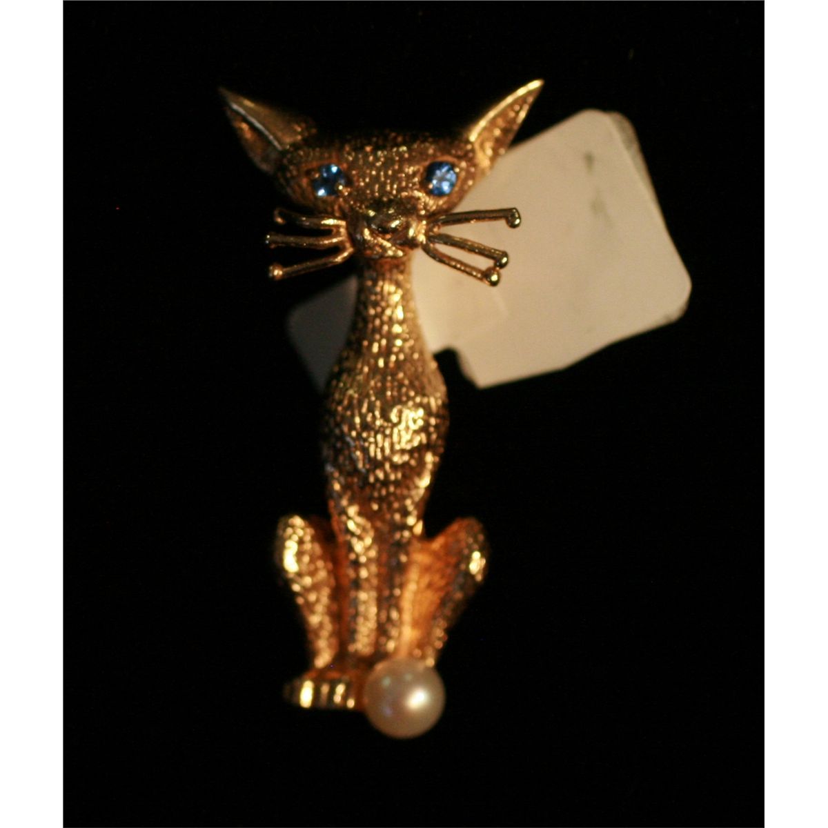 14k Yellow Gold Cat Pin, With Synthetic blue stone eyes and a cultured pearl in one paw, Total weight 6.2 grams, -227097-