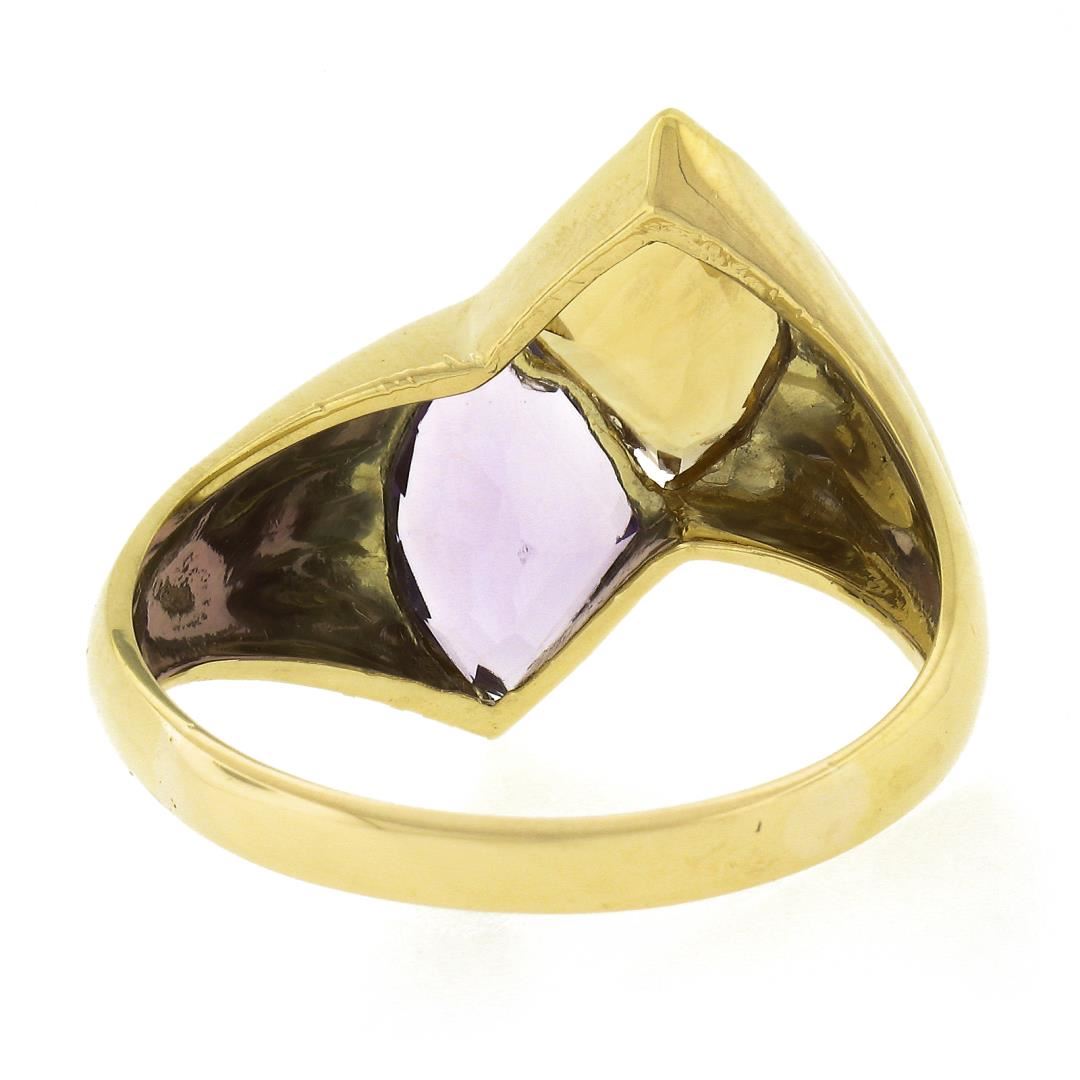 A solid 14k yellow gold ring, featuring 1 fan cut natural citrine (12.9x9mm), and 1 fan cut natrual amethyst (12.9x8.3mm). The ring is size 14.5, weighs a total of 9.09 grams, and measures 22mm wide.