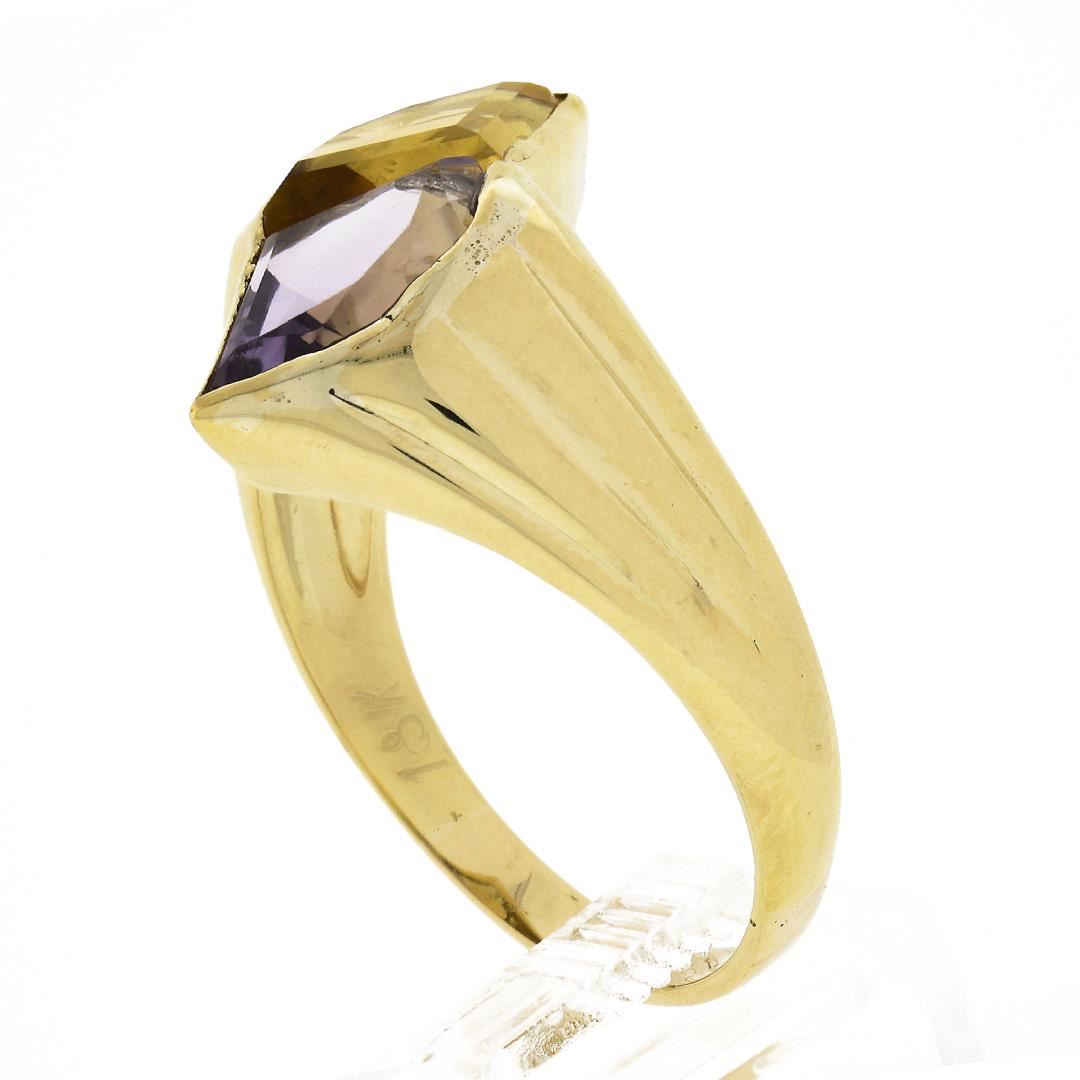 A solid 14k yellow gold ring, featuring 1 fan cut natural citrine (12.9x9mm), and 1 fan cut natrual amethyst (12.9x8.3mm). The ring is size 14.5, weighs a total of 9.09 grams, and measures 22mm wide.