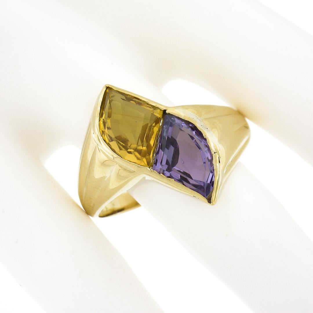 A solid 14k yellow gold ring, featuring 1 fan cut natural citrine (12.9x9mm), and 1 fan cut natrual amethyst (12.9x8.3mm). The ring is size 14.5, weighs a total of 9.09 grams, and measures 22mm wide.