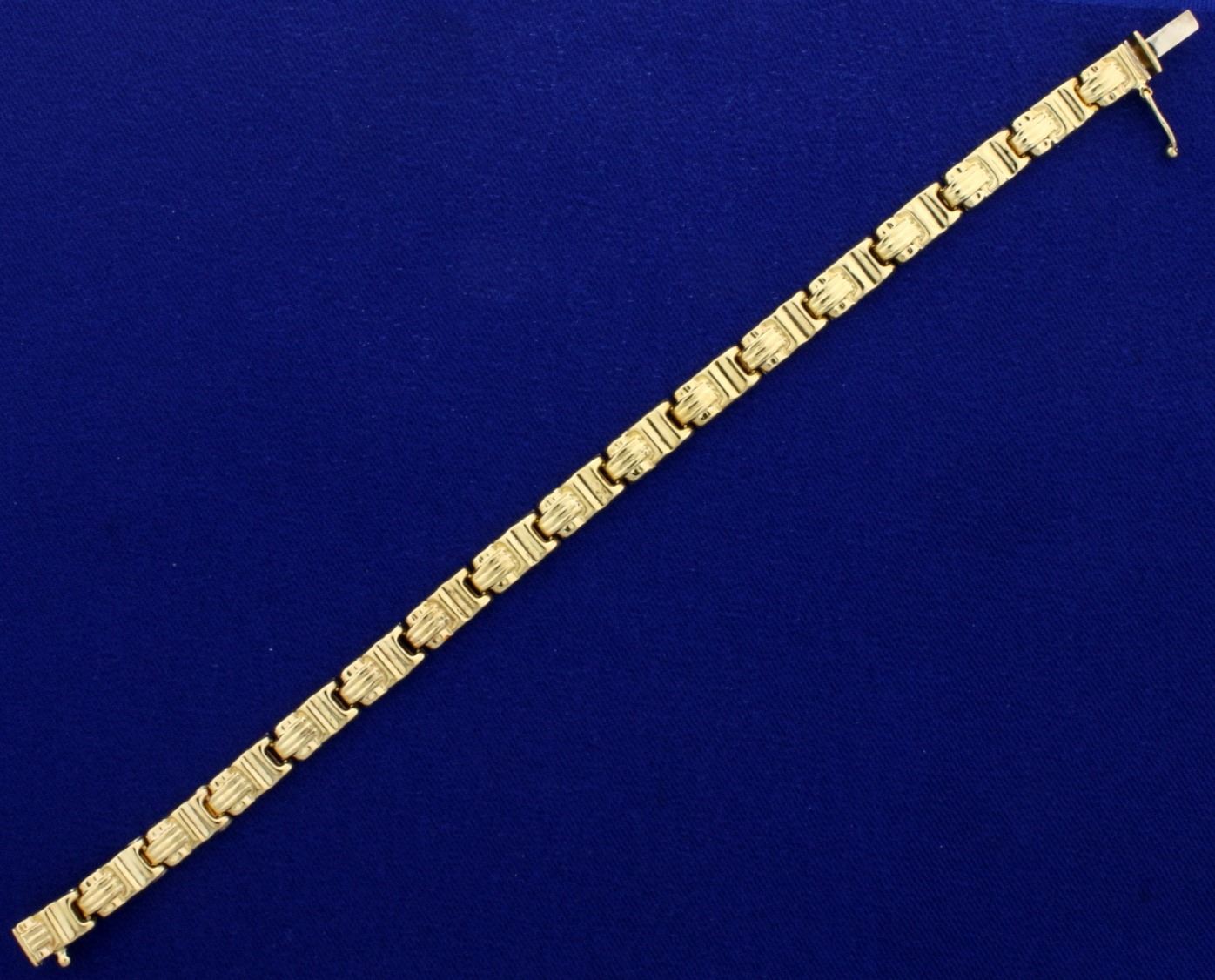 In 14k yellow gold. 7" long and 6.1mm wide with a safety clasp. 9.1g.