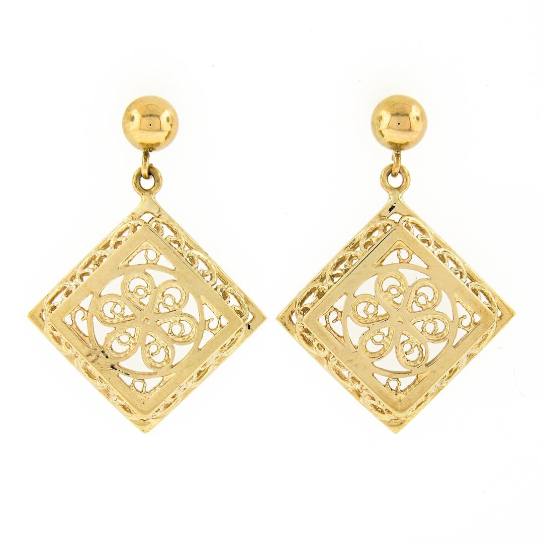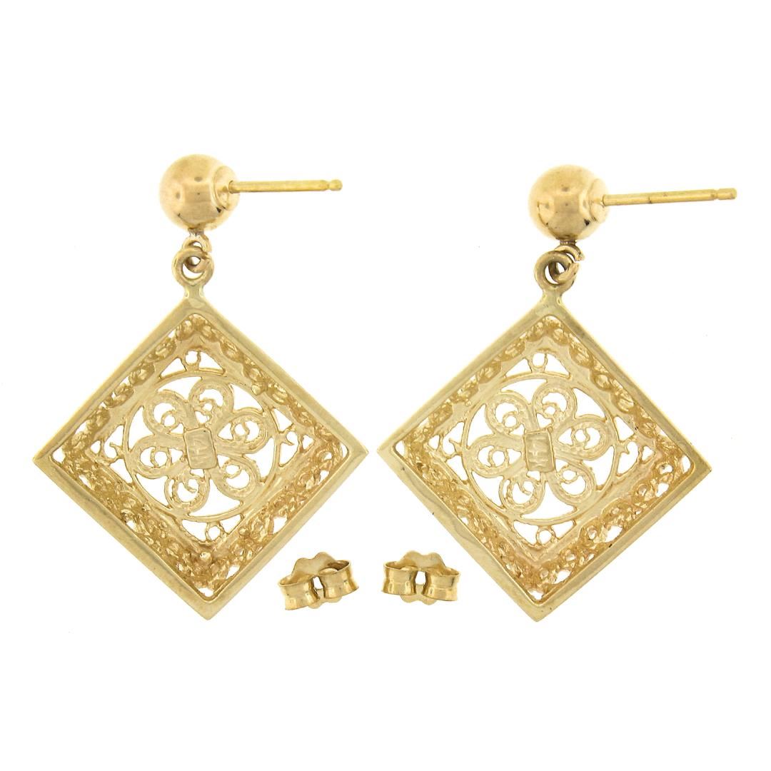 14k Yellow Gold Detailed Filigree Floral Open Work Squared Drop Dangle Earrings