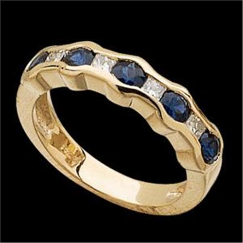 14k Yellow Gold Designer WEDDING BAND featuring 4 Princess Cut DIAMONDS alternating with 5 Genuine Round Blue SAPPHIRES. The Diamond Total Weight = .28 CARATS and the Sapphire Total Weight = .80 CARATS. This elegant Diamond and Sapphire Wedding Band is a Size 6 and I can resize it for you.