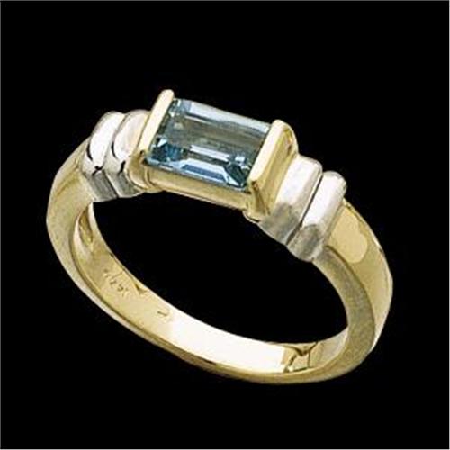 14k Yellow Gold Designer Ring featuring a Genuine Emerald Cut AQUAMARINE = ONE CARAT! The Aquamarine has White Gold accents each side. This elegant ring is a Size 6 and I can resize it for you.