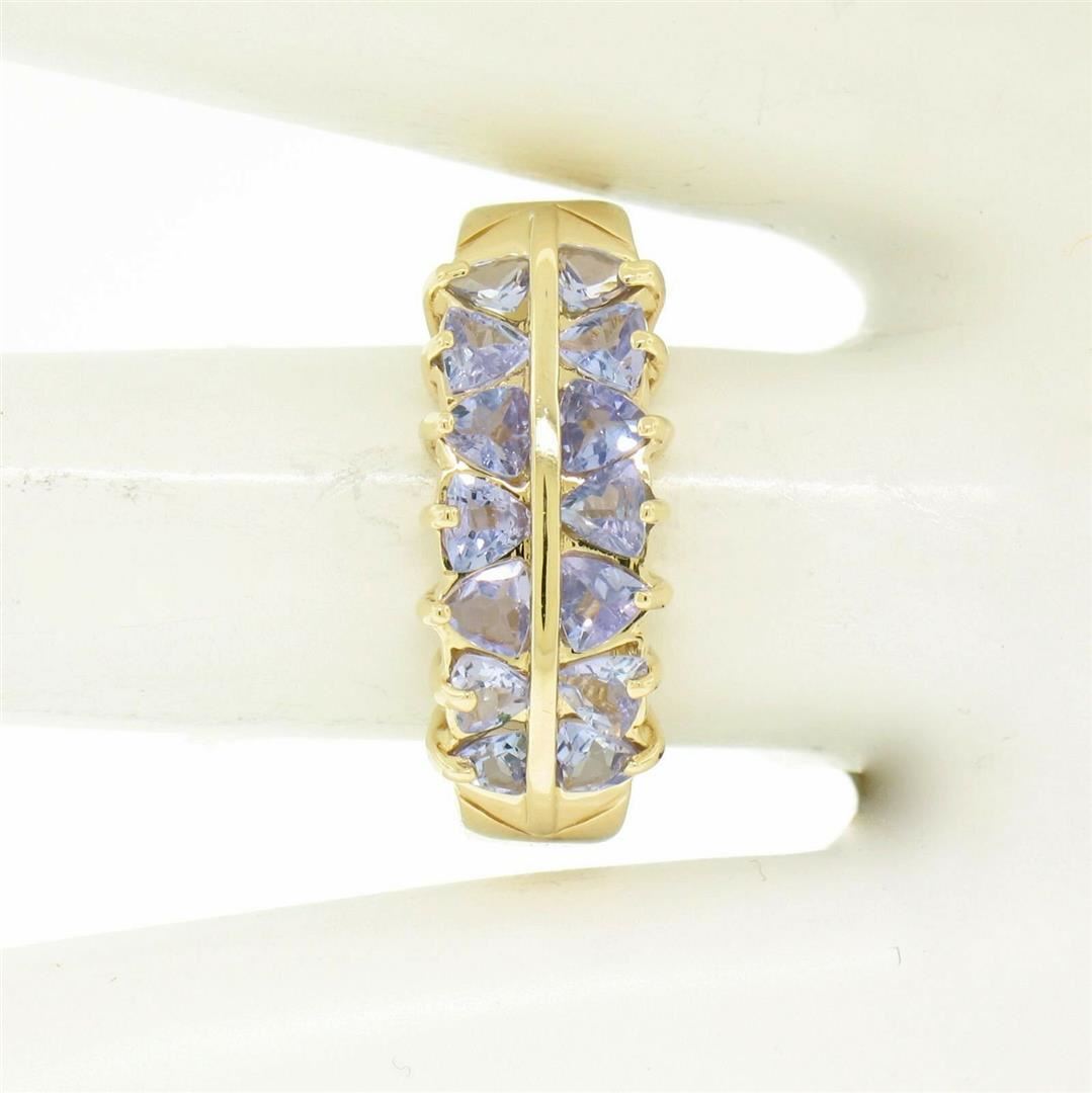 A solid 14k yellow gold band ring prong and channel set with 14 natural trillion cut tanzanites (1.40ctw) with a rich lavender color. The ring is size 8.5, weighs a total of 4.70 grams, and measures 8.5mm wide.