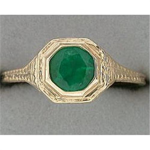 This Antique Style ring is an Accurate and Authentic copy of a ring from the 1930's - and THIS one is in Mint condition. Antique Style 14k Yellow Gold ring featuring a Genuine round Emerald = .45 Carats! The Emerald is surrounded by lovely filigree work. The ring is a size 6 1/2 and I can resize it for you.