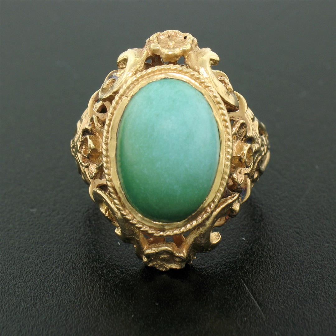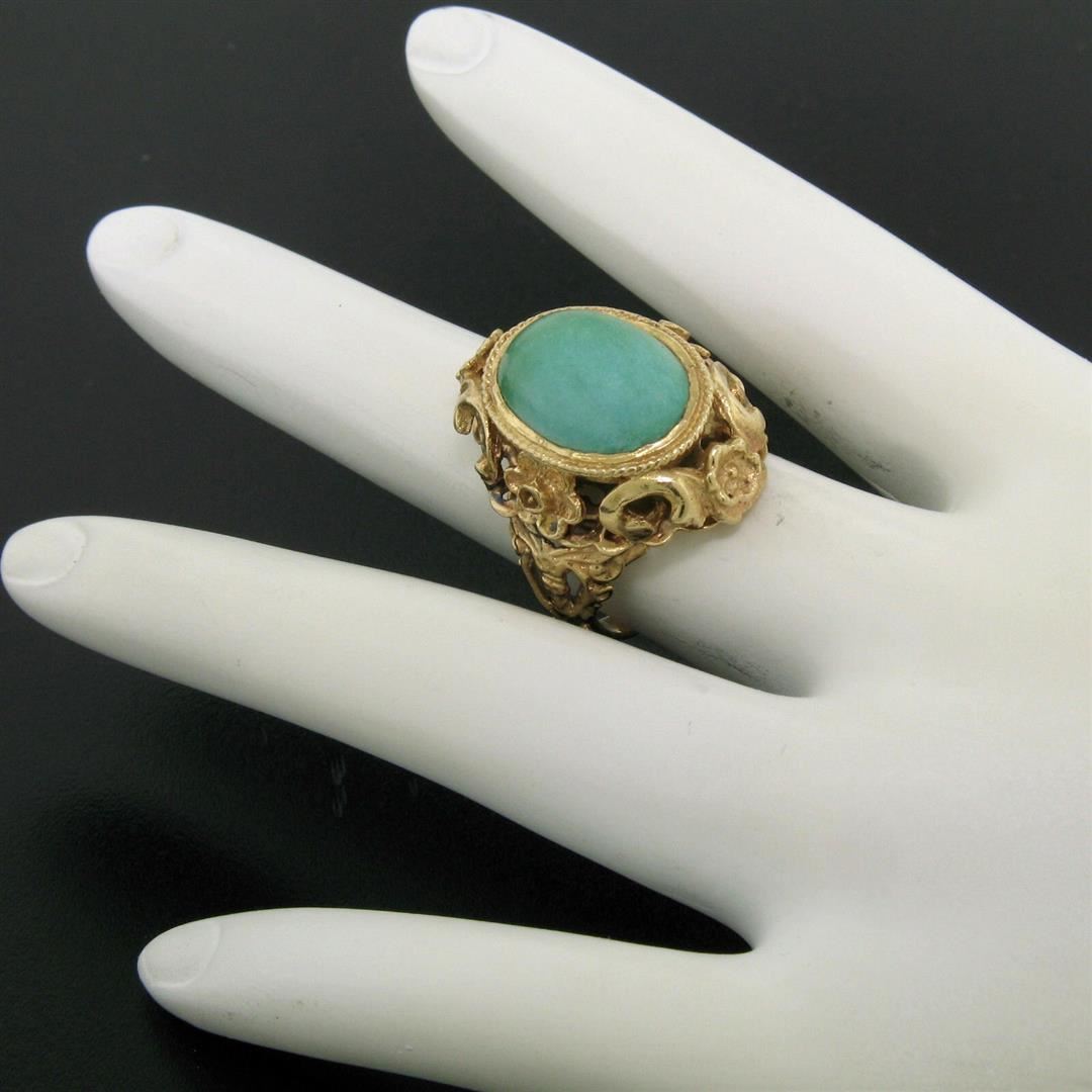 One Vintage 14k Yellow Gold Etched Open Work Bezel Set Oval Cabochon Persian Turquoise Solitaire Ring. Item Details - Material: 14k Solid Yellow Gold, Weight: 8.8 Grams, Stone(s): (1) Natural Genuine Persian Turquoise - Oval Cabochon Cut - Bezel Set - Natural Turquoise Color - 14.0x10.0mm (approx.), Ring Size: 5 (We can custom size this ring.), Ring Width: 24.0mm, Ring Height: 11.9mm rise off the finger, Condition: Vintage piece - Amazing, all original condition!