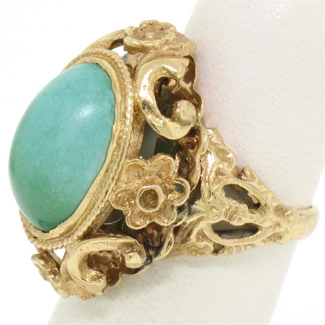 One Vintage 14k Yellow Gold Etched Open Work Bezel Set Oval Cabochon Persian Turquoise Solitaire Ring. Item Details - Material: 14k Solid Yellow Gold, Weight: 8.8 Grams, Stone(s): (1) Natural Genuine Persian Turquoise - Oval Cabochon Cut - Bezel Set - Natural Turquoise Color - 14.0x10.0mm (approx.), Ring Size: 5 (We can custom size this ring.), Ring Width: 24.0mm, Ring Height: 11.9mm rise off the finger, Condition: Vintage piece - Amazing, all original condition!