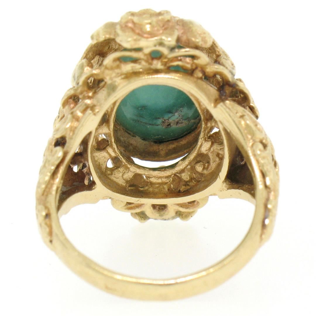 One Vintage 14k Yellow Gold Etched Open Work Bezel Set Oval Cabochon Persian Turquoise Solitaire Ring. Item Details - Material:  14k Solid Yellow Gold, Weight:  8.8 Grams, Stone(s):  (1) Natural Genuine Persian Turquoise - Oval Cabochon Cut - Bezel Set - Natural Turquoise Color - 14.0x10.0mm (approx.), Ring Size:  5 (We can custom size this ring.), Ring Width:  24.0mm, Ring Height:  11.9mm rise off the finger, Condition:  Vintage piece - Amazing, all original condition!