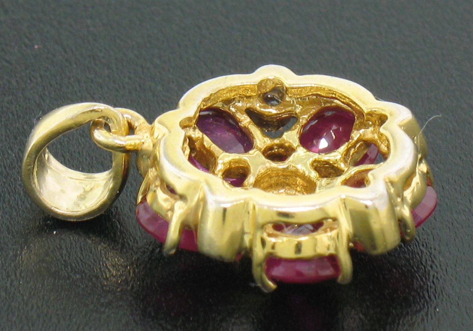 One 14k Yellow Gold Flower Pendant 2.10ctw Oval Blood Red Rubies Bezel Set Diamonds. Item Details: Material: 14k Solid Yellow Gold, Weight: 2.7 Grams, Stone(s): (5) Natural Genuine Rubies - Oval Cut - Prong Set - Rich Blood Red Color - 4.8x3.8mm / 2.00ctw (approx.), (6) Natural Genuine Diamonds - Round Brilliant Cut - Bezel Set - VS2 Clarity - G Color - 0.10ctw (approx.), Total Carat Weight: 2.10 (approx.), Chain Type: Not Included, Width: 13.95mm, Height (w/o Bail): 13.95mm, Condition: Estate piece. Like New!