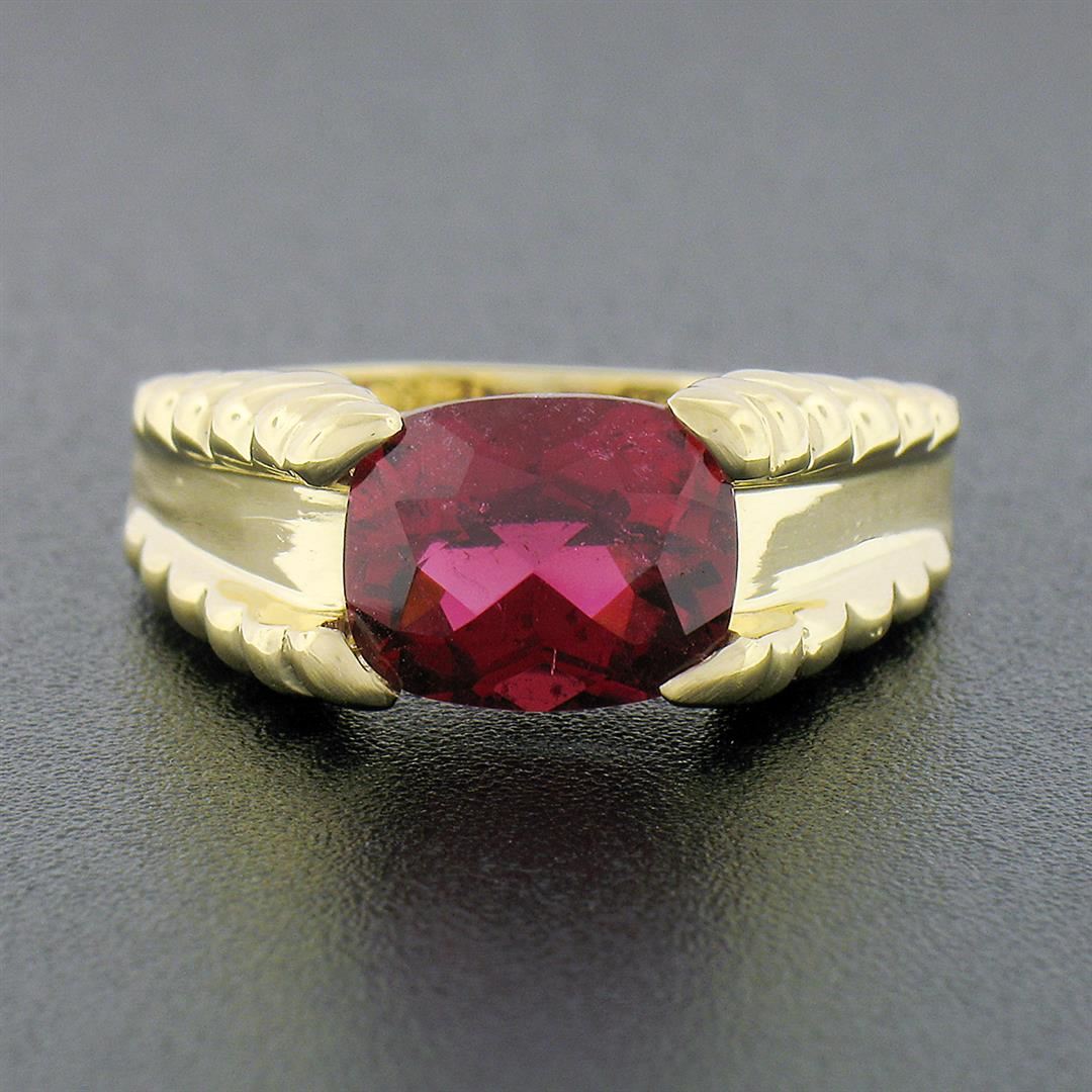 A solid 14k yellow gold solitaire rinf, with 1 Gia certified cushion cut natural tourmaline (3ct). The ring is size 9.0, weighs a total of 5.94 grams, and measures 8.50mm wide. Comes with all original relevant certifications.