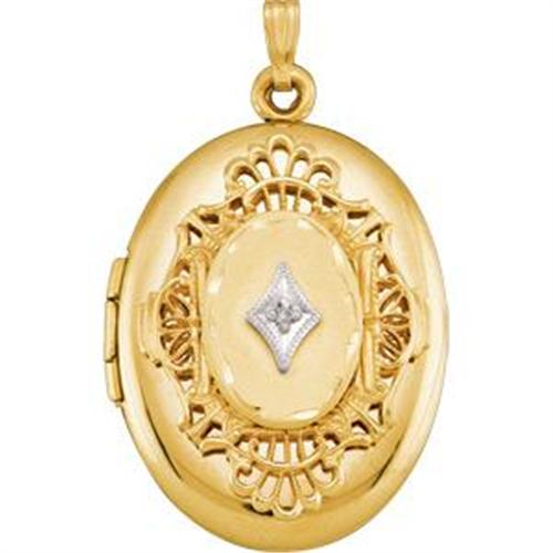 This Beautiful Oval Locket Pendant is 14k Yellow Gold and it measures 1 1/4" x 1". It features magnificent raised Goldwork with a DIAMOND in the center. The Gold Locket opens to hold 2 photos.