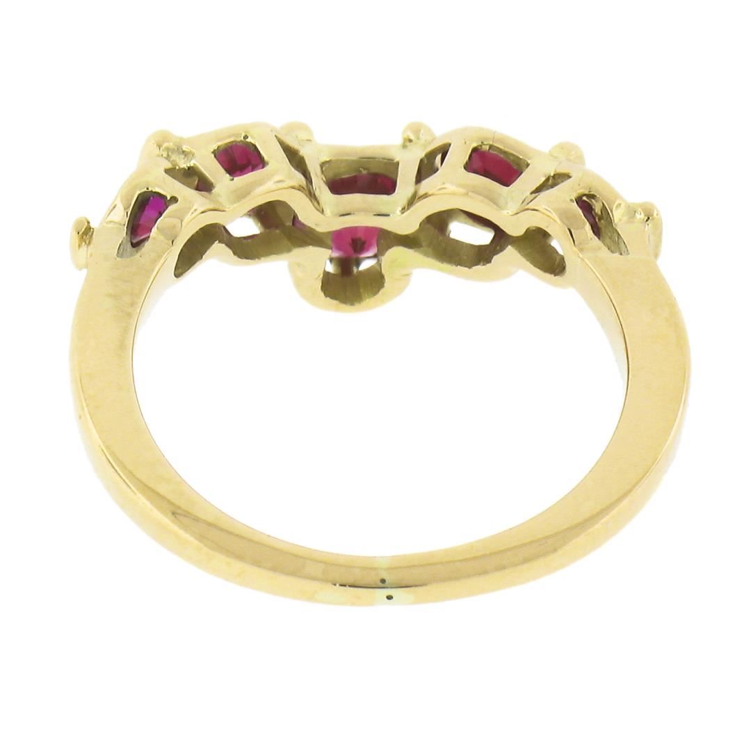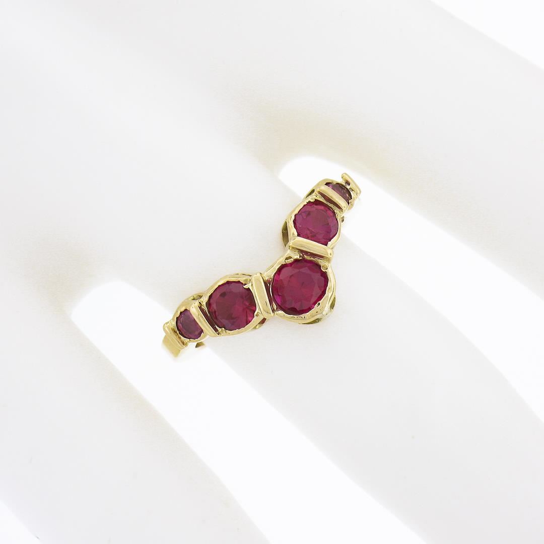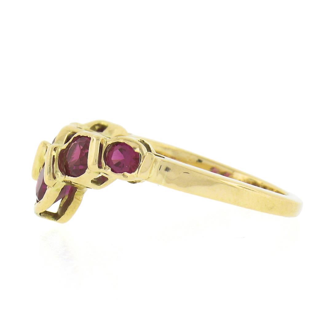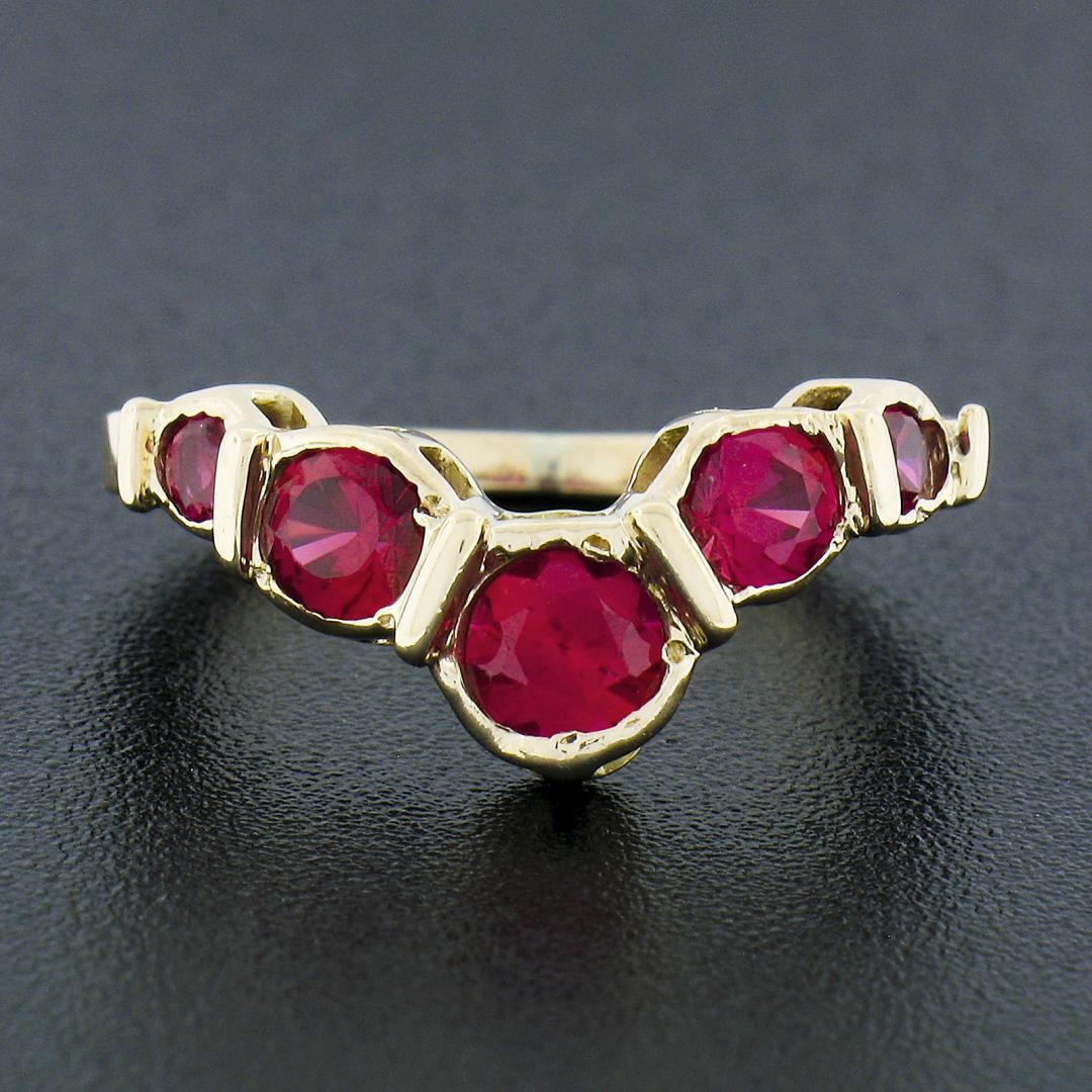 A solid 14k yellow gold chevron band ring, featuring 5 round synthetic rubies/sapphires. The ring is size 4.5, weighs a total of 2.93 grams, and measures 5.75mm wide.