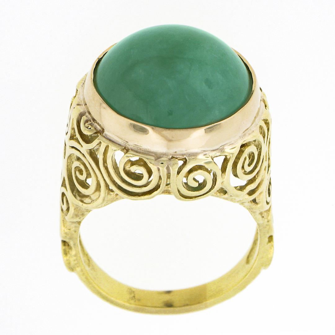 a solid 14k yellow gold open work ring, with 1 round cabochon cut natrual jade (16mm ). The ring is size 9.0, weighs a total of 13.19 grams, and measures 20mm wide.