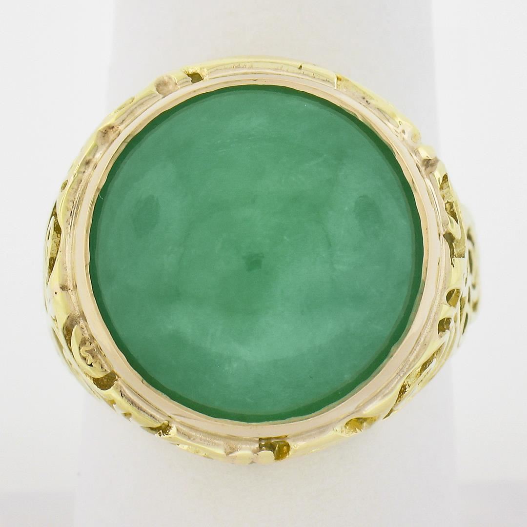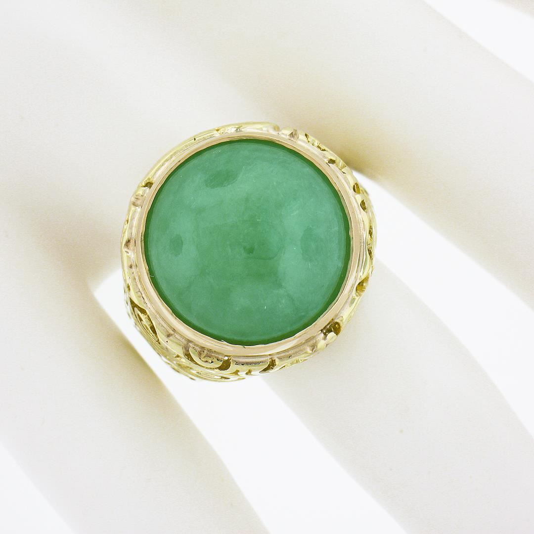 a solid 14k yellow gold open work ring, with 1 round cabochon cut natrual jade (16mm ). The ring is size 9.0, weighs a total of 13.19 grams, and measures 20mm wide.
