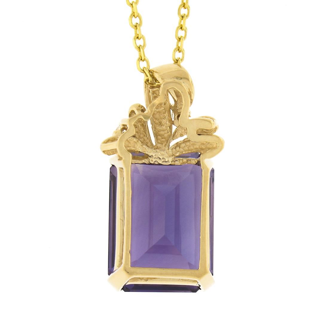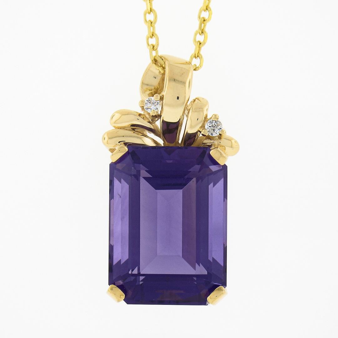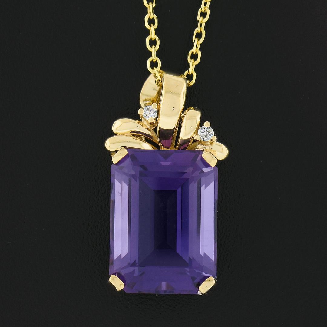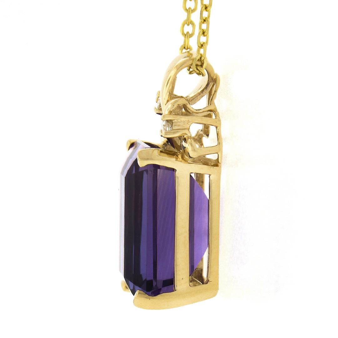 A solid 14k yellow gold pendant necklace, with 1 emerald cut natural amethyst (12x16mm / 12.08ct), and 2 round brilliant cut natural diamonds (G- I1 ; 0.05ctw ). 18 inch cable link chain, 7.89 grams total weight, pendant measures 26x14.25mm.