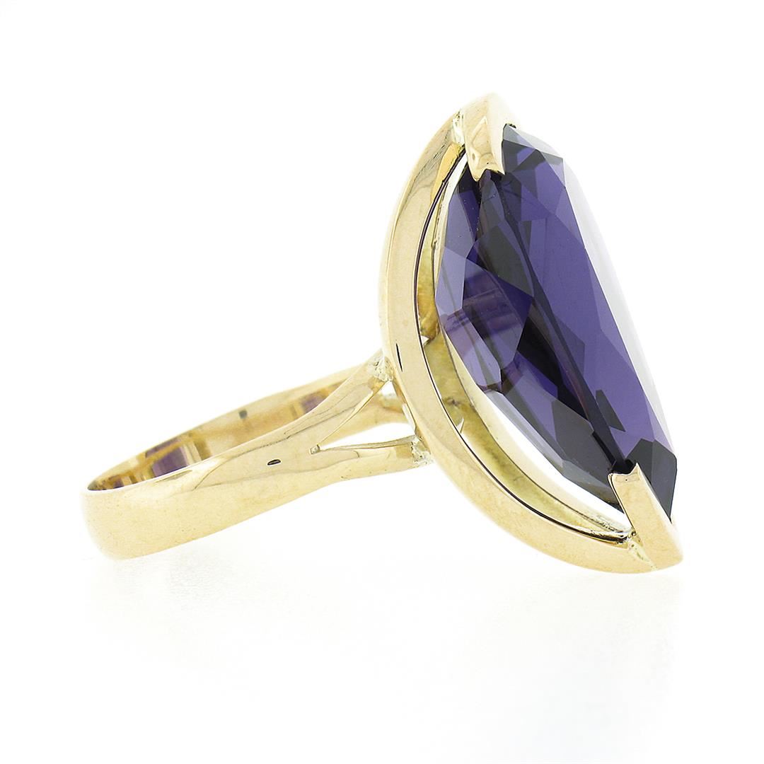 A solid 14k yellow gold cocktail solitaire ring, with 1 pear cut purple stone (21.75x14.35mm). The ring is size 7.0, weighs a total of 9.50 grams, and measures 25.75mm wide.