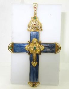 14K Yellow Gold Multi-colored Stones and Diamond Cross Pendant.The total Pendant's weight is 51.3 grams.The total weight of diamonds is 0.4 cts. approximately H color and SI clarity.The size of the each Lapis is 0.5" x 3" and 0.5" x 2.5".The total weigh of Emerald is 0.3 ct. approximately.The total weight of Ruby is 0.1ct. approximately.The size of the Pendant is 5" x 3.25" , Thickness: 4 mm.