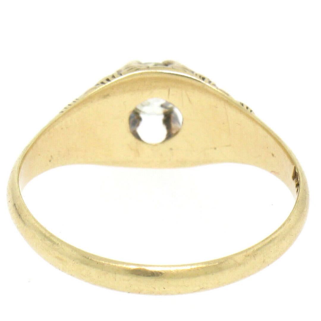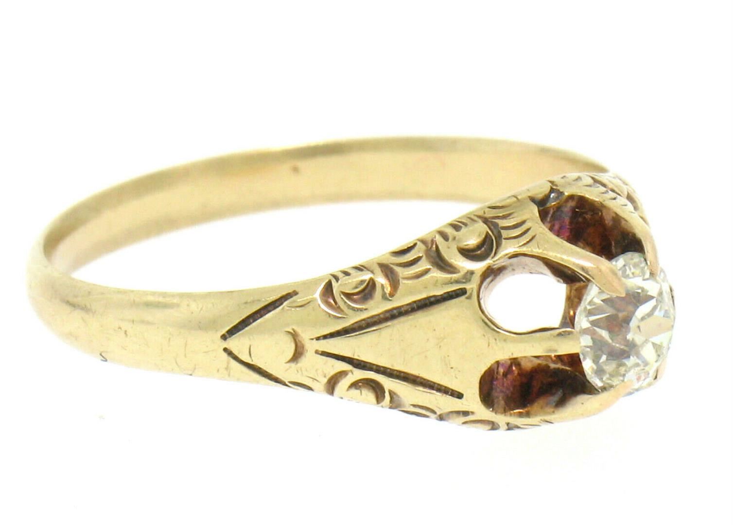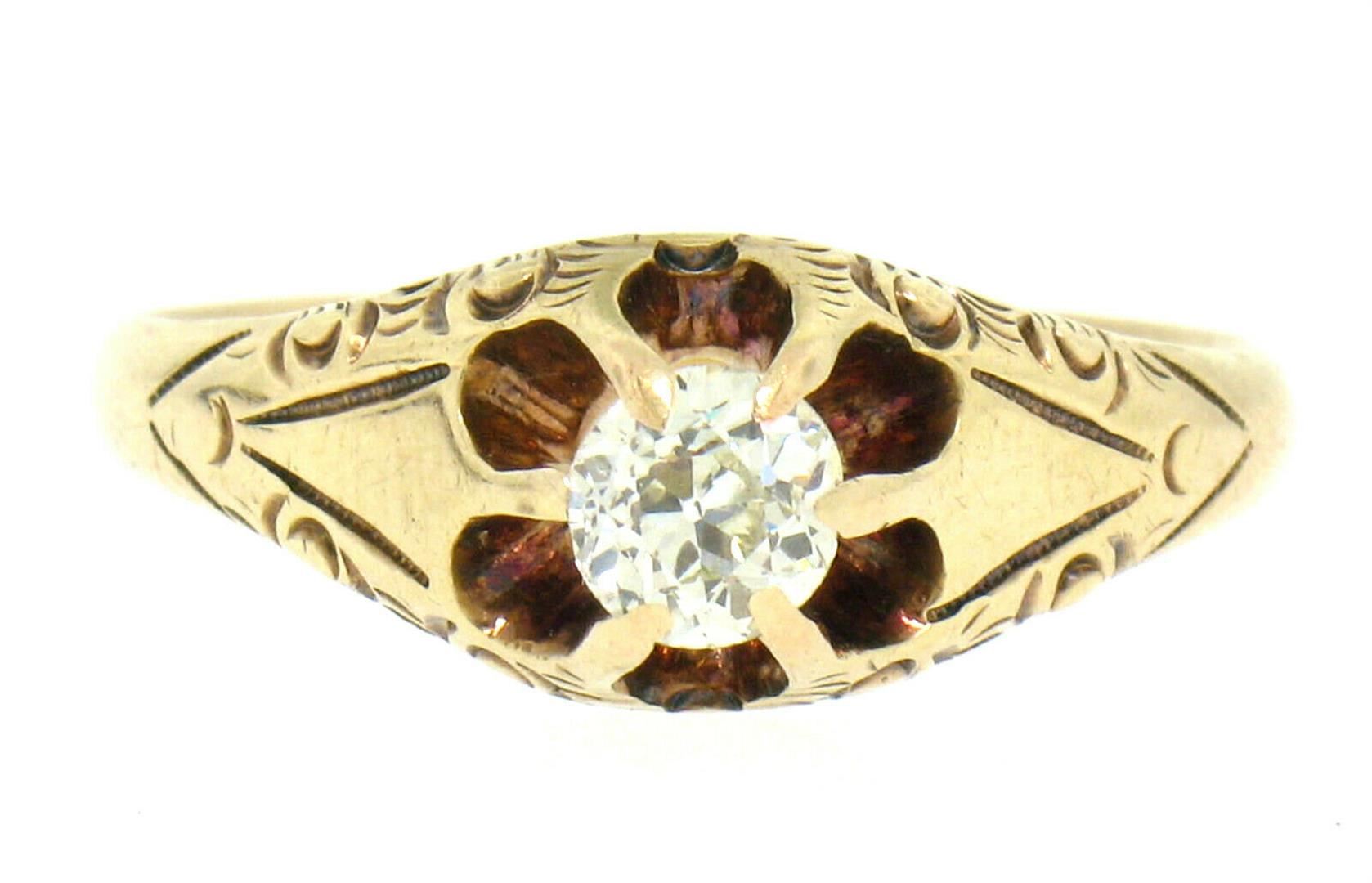 One Vintage 14k Yellow Gold Old European Cut Diamond Solitaire Engraved Belcher Ring. Item Details: Material: Solid 14k Yellow Gold, Weight: 3.30 Grams, Stone(s): (1) Natural Genuine Diamond - Old European Cut - Belcher Prong Set - J Color - VS1 Clarity, Total Carat Weight: 0.38 (approx.), Ring Size: 8.25 (We can custom size this ring.), Ring Width: 8.10mm, Condition: Vintage piece in great overall condition. Shows some wear but is 100% ready to wear.